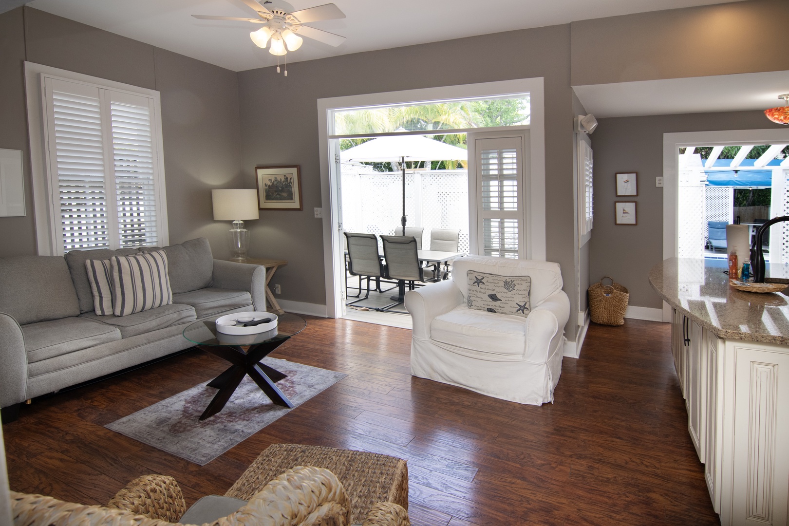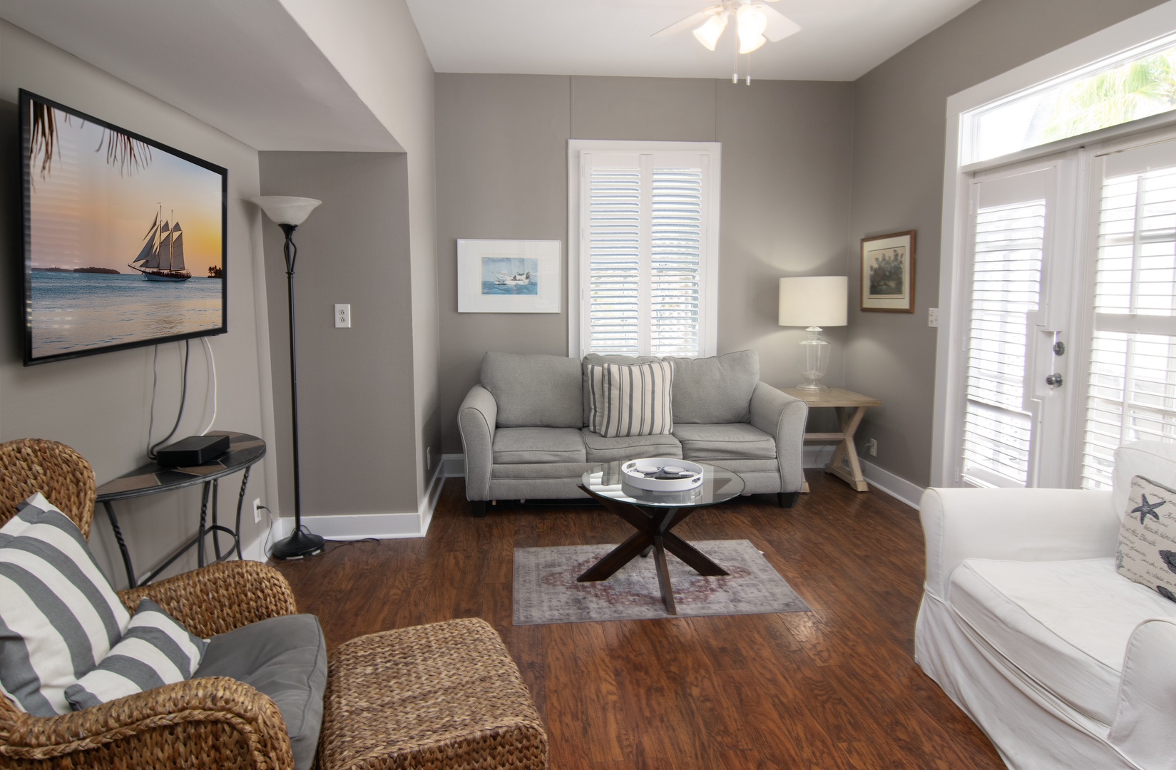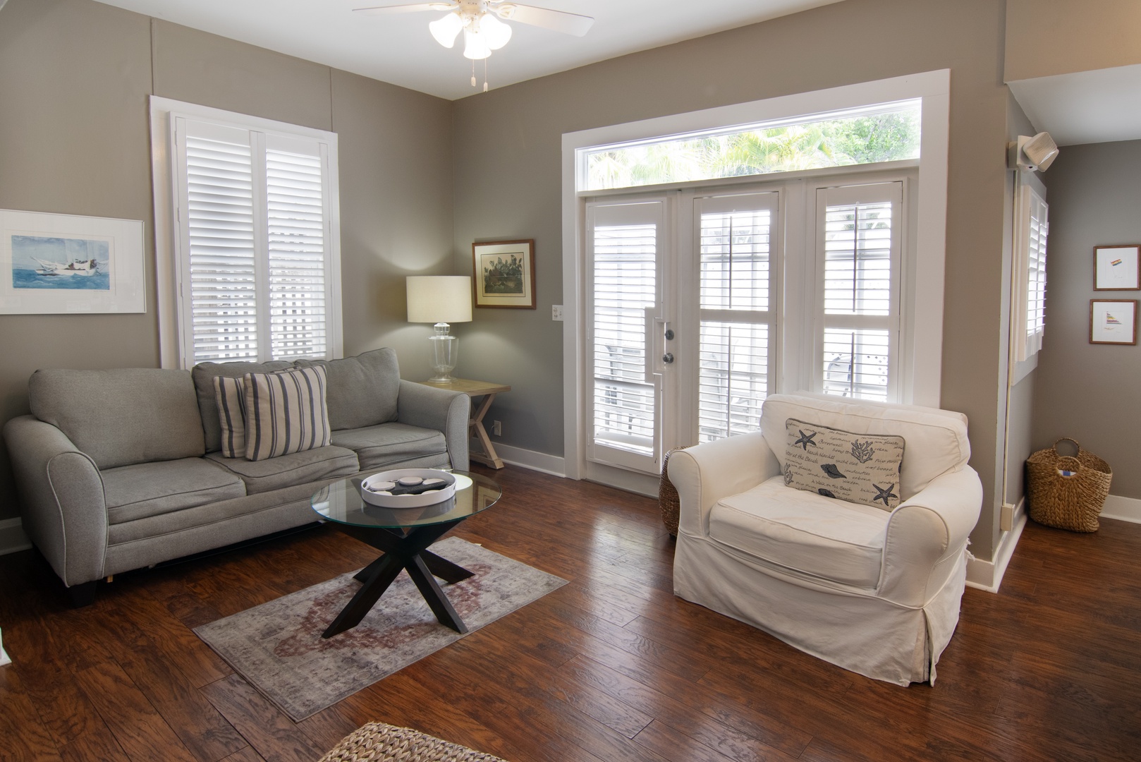 The bright, contemporary living space has polished, rich wood flooring, which imbues a warm island vibe. The driftwood gray interior pops with accents of white and cream. Relax on the plush sofa or armchairs to socialize, read, or stream your favorite shows on the wall-mounted SmartTV with Roku. Stylish coffee tables, lamps, a ceiling fan, and large windows enhance the space. This living space has French doors, which open to a private deck with alfresco dining.