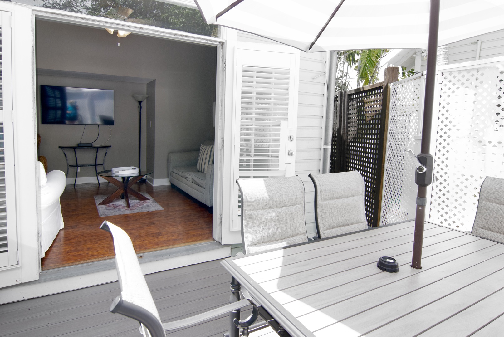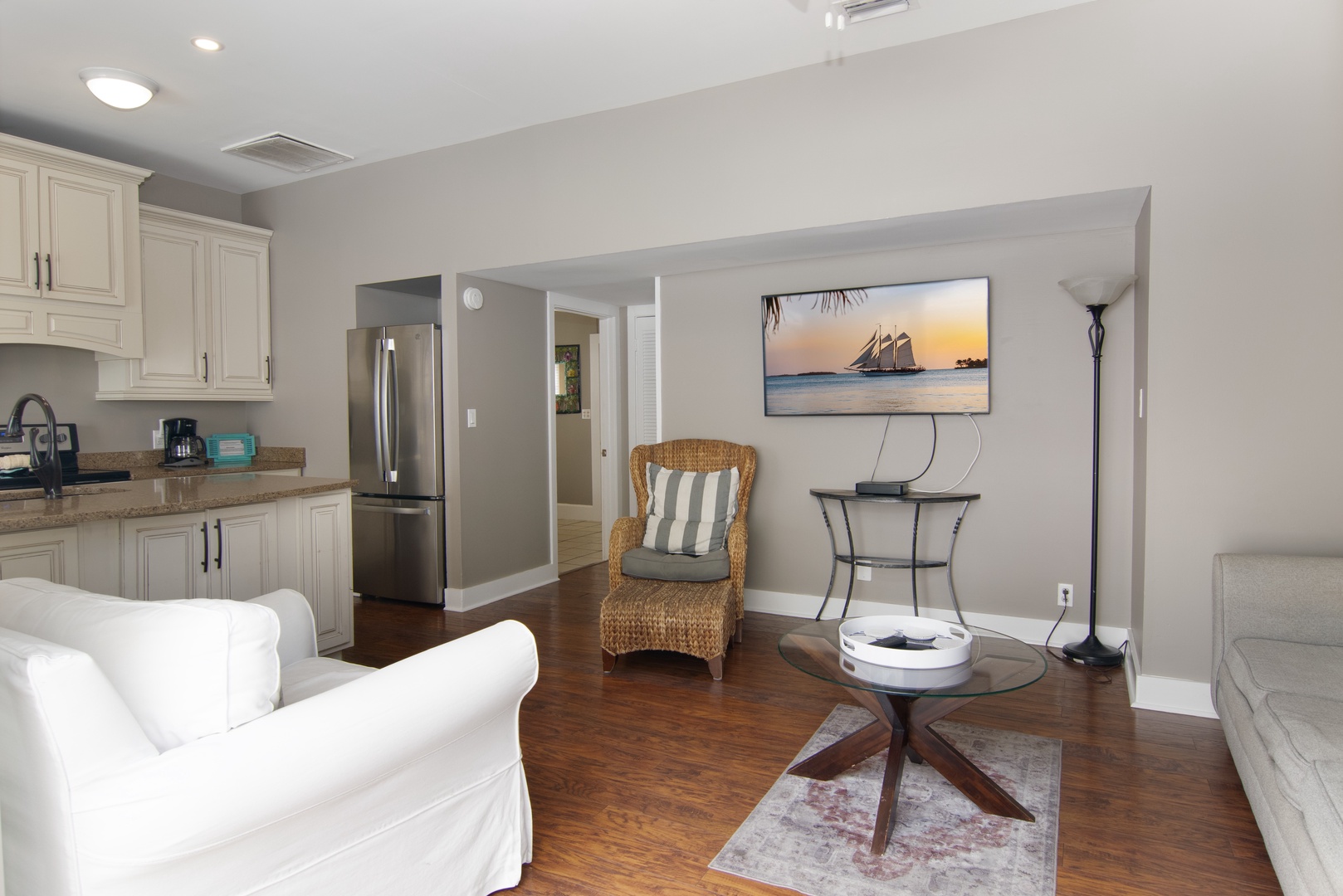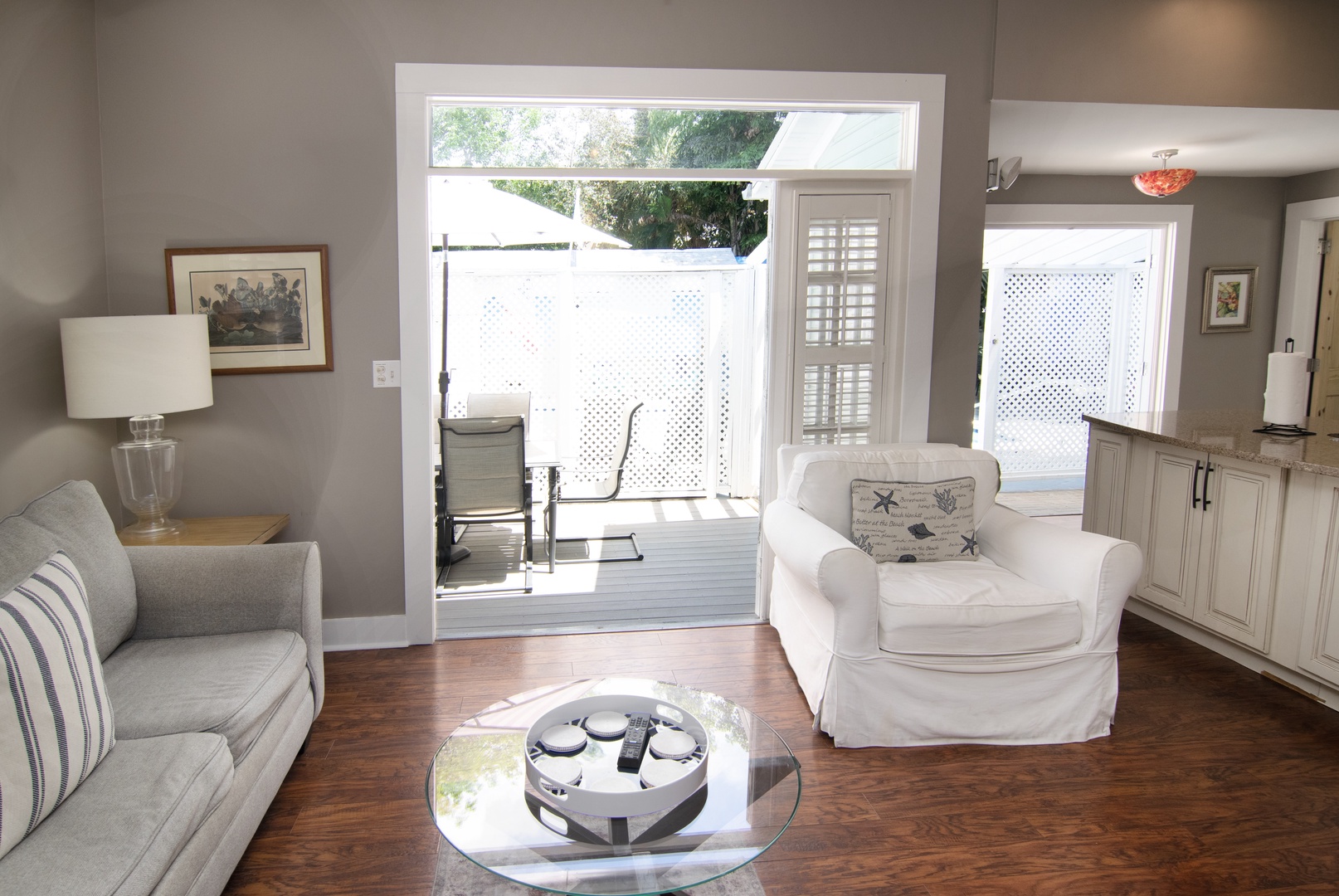 The bright, contemporary living space has polished, rich wood flooring, which imbues a warm island vibe. The driftwood gray interior pops with accents of white and cream. Relax on the plush sofa or armchairs to socialize, read, or stream your favorite shows on the wall-mounted SmartTV with Roku. Stylish coffee tables, lamps, a ceiling fan, and large windows enhance the space. This living space has French doors, which open to a private deck with alfresco dining.