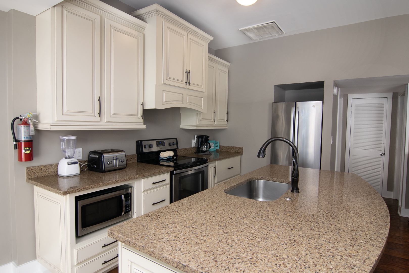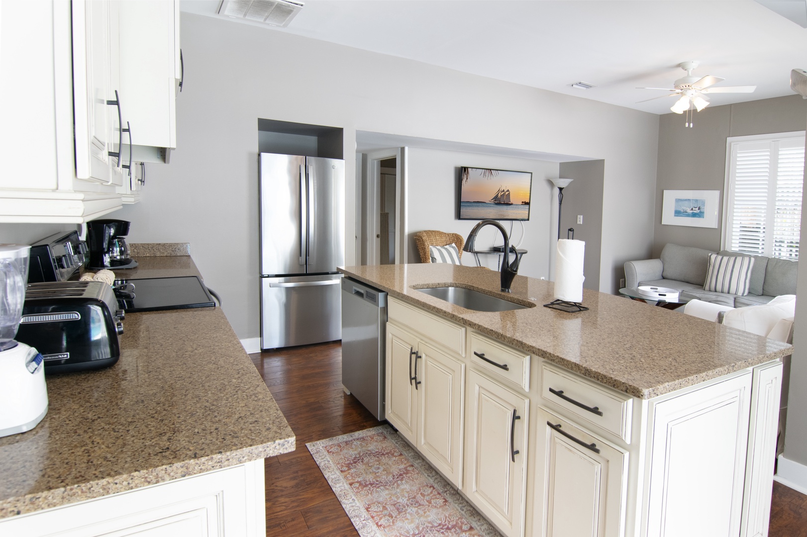 The open-concept kitchen/living space makes for easy entertaining and socializing. The sleek, fully-stocked modern kitchen has cream-colored, custom hardwood cabinets, granite countertops, and stainless appliances, including a glass-top electric stove, oven, microwave, dishwasher, full-size fridge, and farmhouse-style island sink. Prepare a tropical feast after a day at the beach!