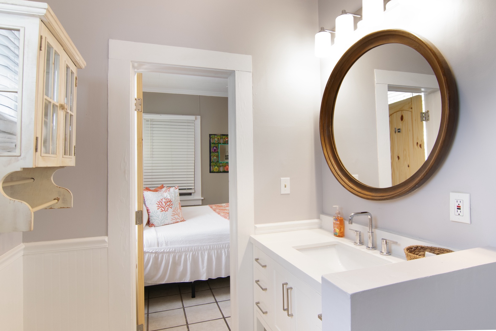 Tropical Cottage has two bedrooms and two bathrooms. Both air-conditioned bedrooms have tile floors and ceiling fans. Both sparkling-clean, beautifully remodeled bathrooms have water-saving toilets, toiletries, and hair dryers.