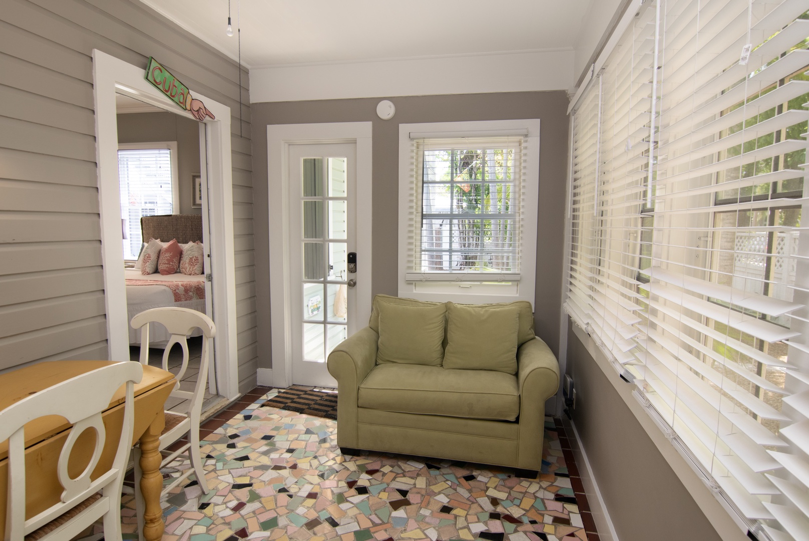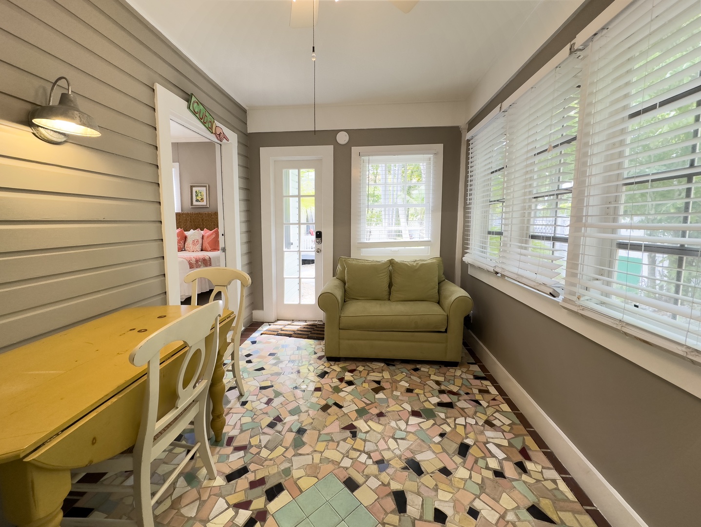 Just off the primary bedroom is a sunroom/breakfast nook with extra living space. This bonus room offers multi-purpose space (TV lounge/office/kid or teen space) and has a private entrance from the courtyard. This cozy room has an authentic island vibe with colorful mosaic floors, a wall of windows, a ceiling fan, and an air conditioner. Relax on the key-lime colored loveseat to stream movies on the Smart TV. The dinette can seat two or more.
