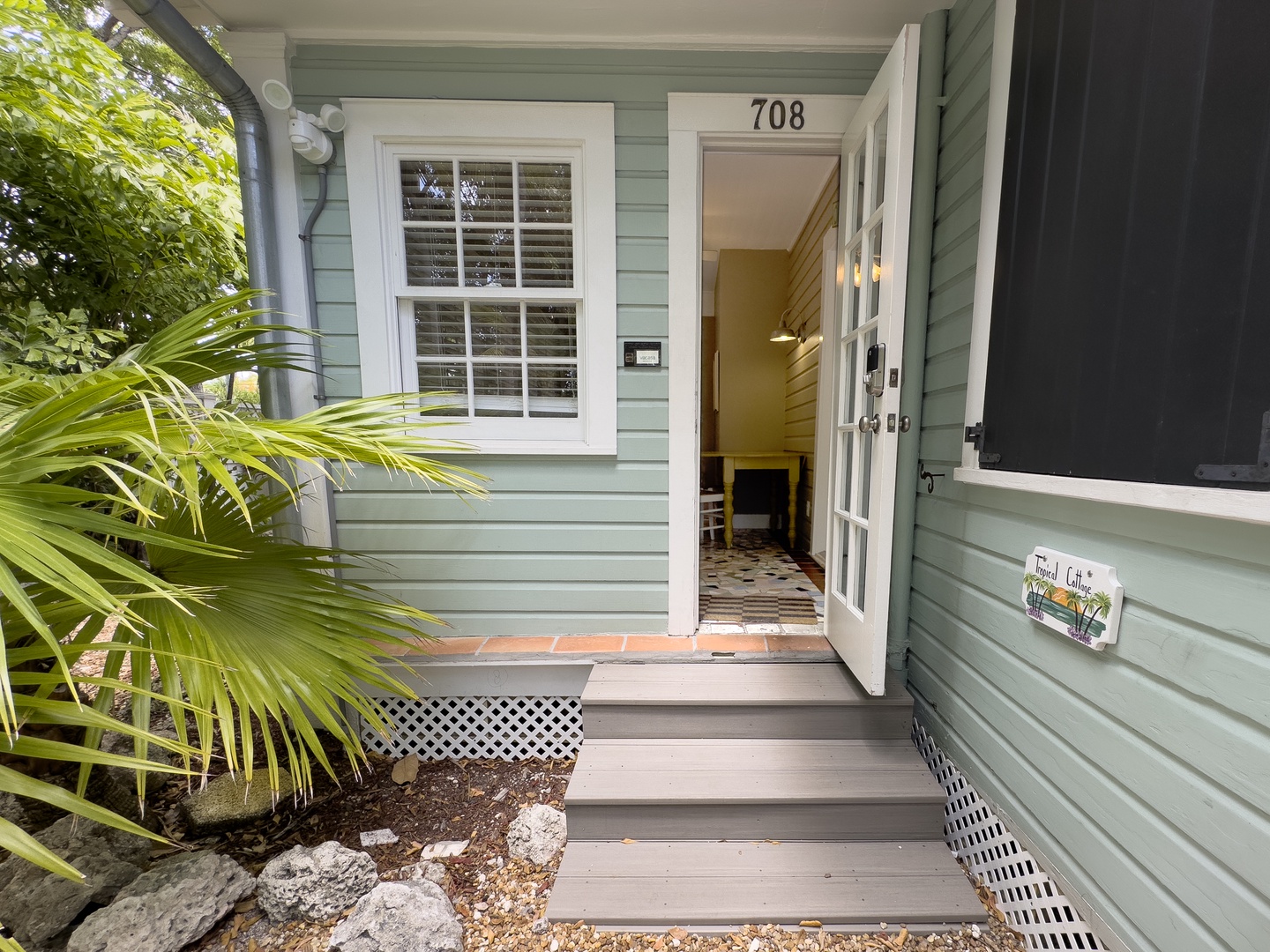 Tropical Cottage is a quintessential 1930s-era Conch bungalow, lovingly renovated with contemporary island elegance. The sage-green exterior blends Caribbean and Victorian influences: crisp white trim, abundant windows, and black Bahamian shutters. This charming cottage is set back from the street and shaded by gardens, mature palms, and gumbo limbo trees in a quiet, upscale, gated enclave of six historic Old Key West vacation rentals. The spacious pea-gravel courtyard boasts tropical landscaping, coral and rock hardscaping, and stone walkways leading to the shared pool area.