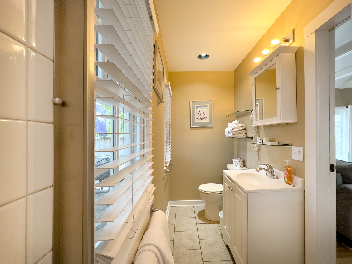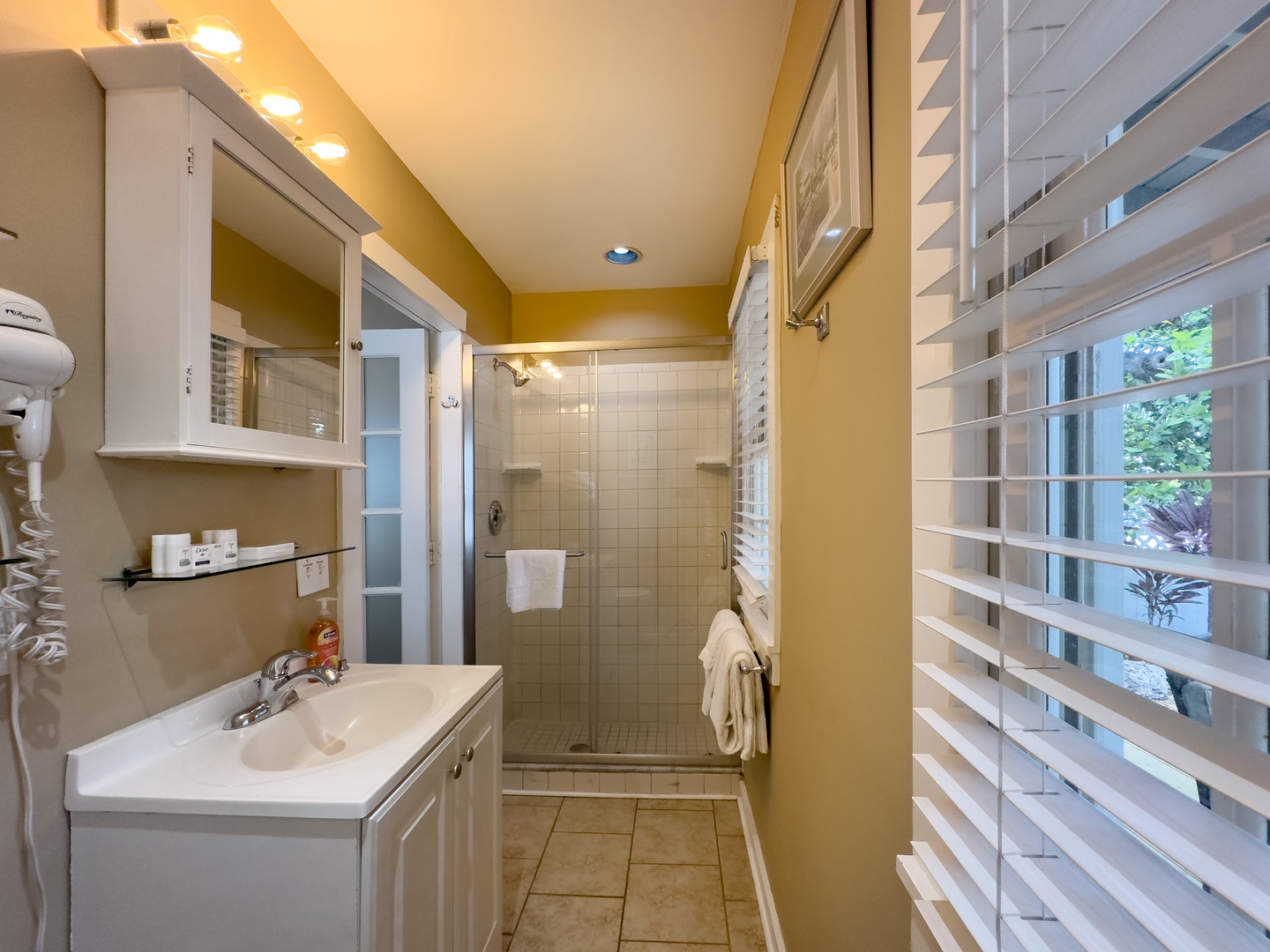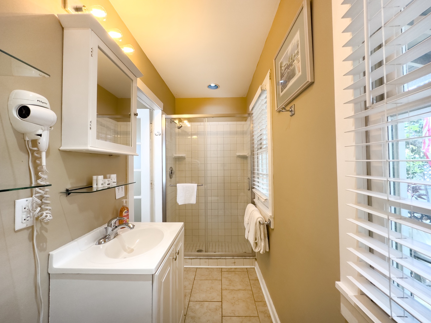 The main floor bathroom, just off the living area, has a single-sink vanity and a glass door walk-in shower. Both bathrooms have rain shower heads, handicap bars, towels, toiletries, and hair dryers.