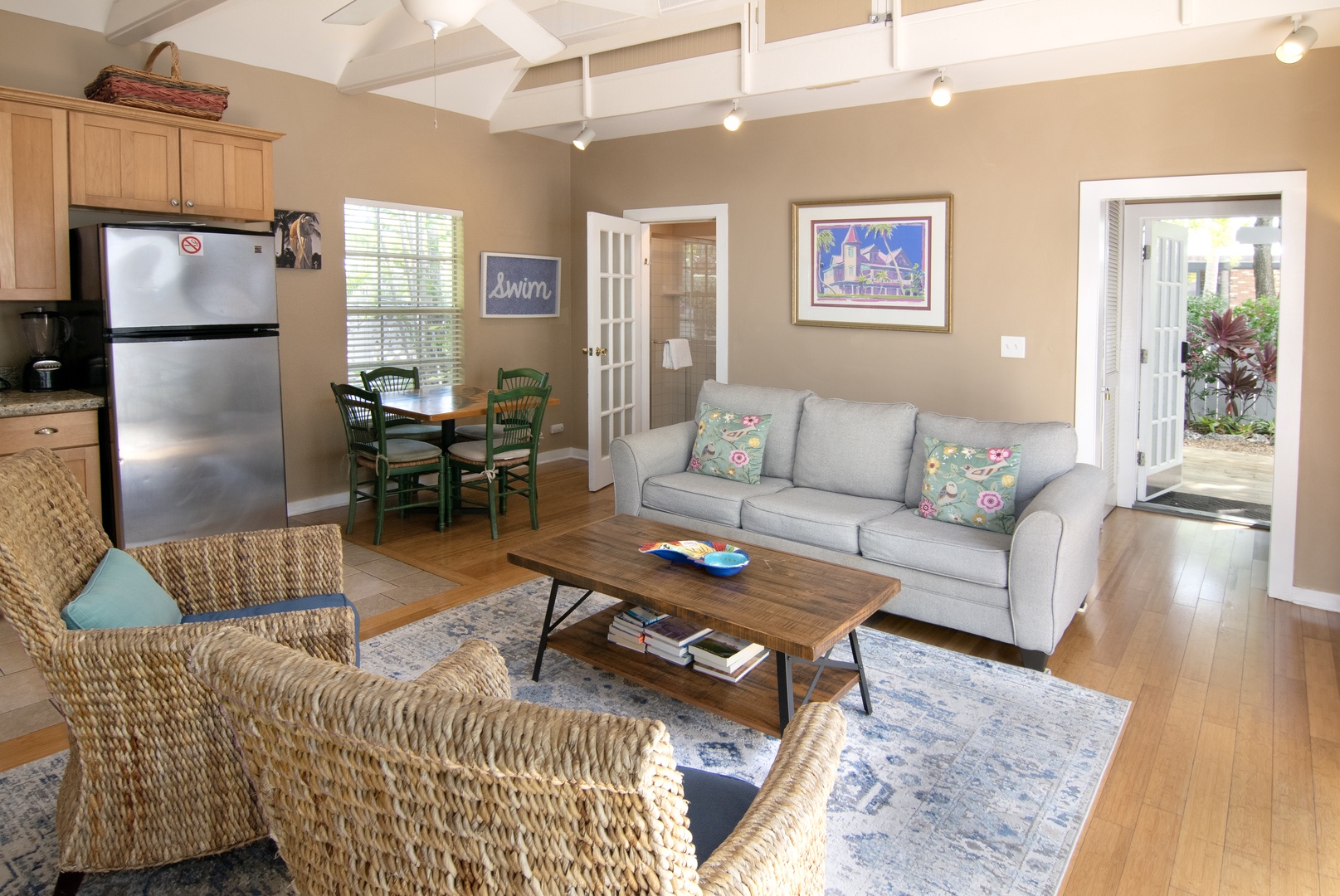 Bright, sunny, open concept kitchen/dining/living space: high ceilings, whitewashed exposed beams & large windows. French doors open out to a courtyard boardwalk leading to the shared pool area. This comfortable, tropical living space has bamboo flooring, ratan-style armchairs, a coffee table, and a plush, designer sleeper sofa. Relax here to socialize, read, or stream your favorite shows on the SmartTV with Roku. The earthy color palette of driftwood, seagrass, and dune has accents of powder blue, aqua, sunset red, and alocasia green.