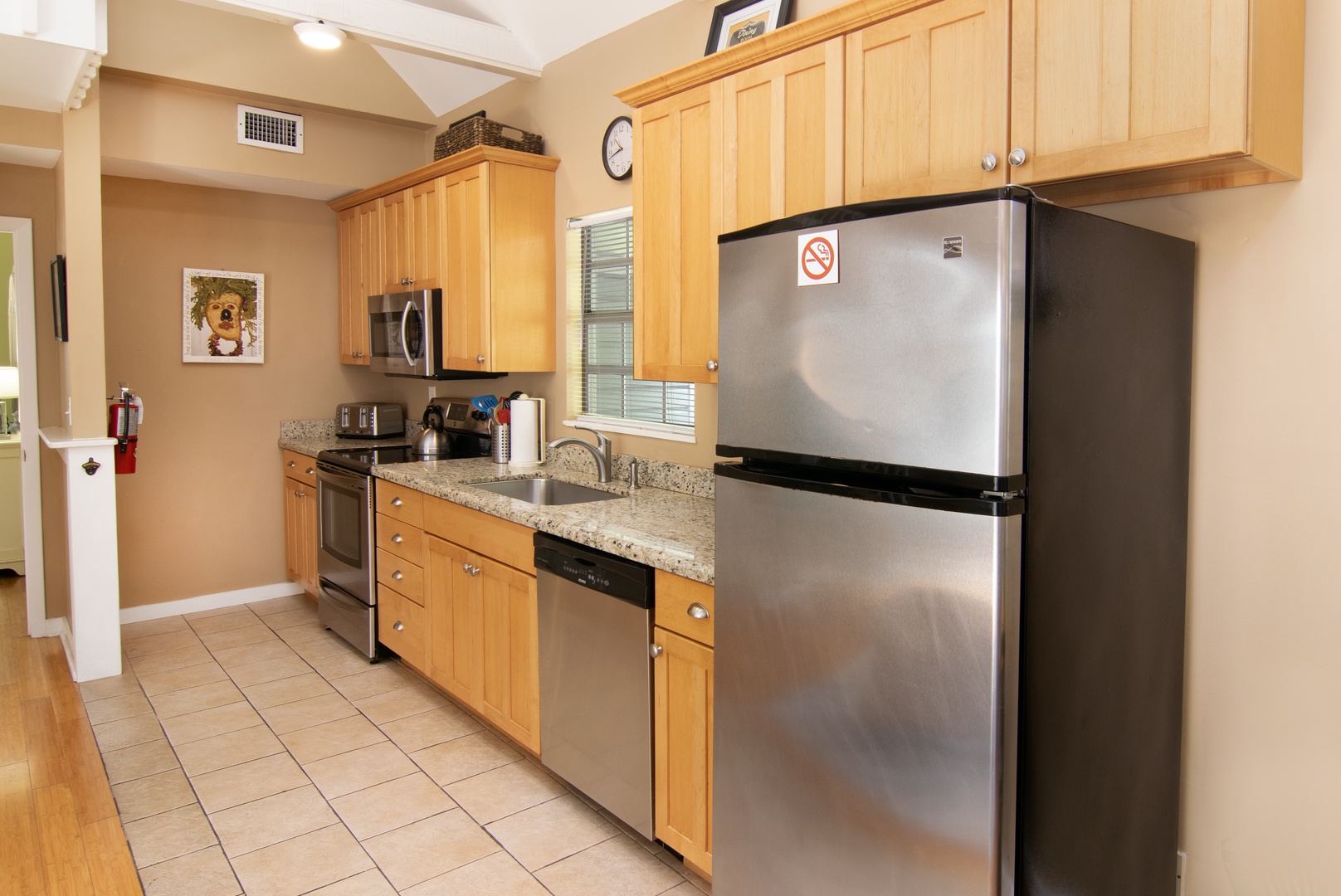 The sleek, fully equipped galley kitchen has granite counters, hardwood cabinets, tile floors, and stainless appliances, including a glass-top stove, oven, microwave, dishwasher, full-size fridge, and farmhouse sink. Prepare a tropical feast after a day at the beach! The open design ensures that a chef is never isolated from the group.