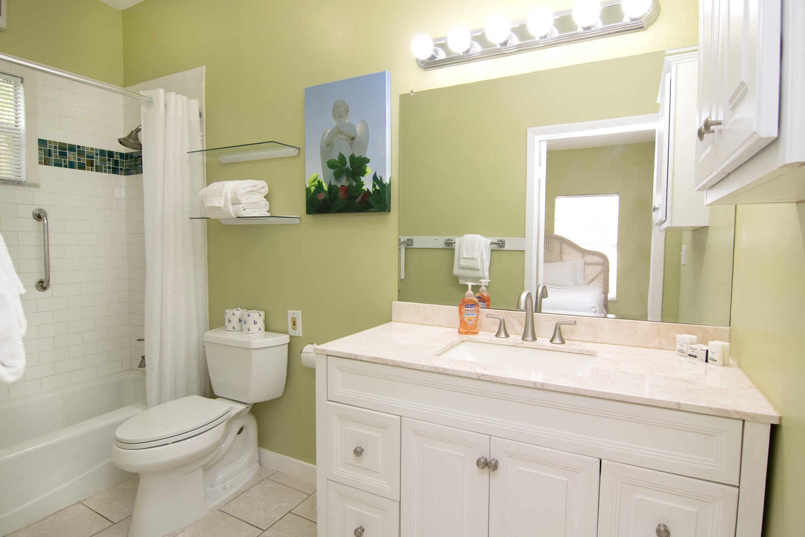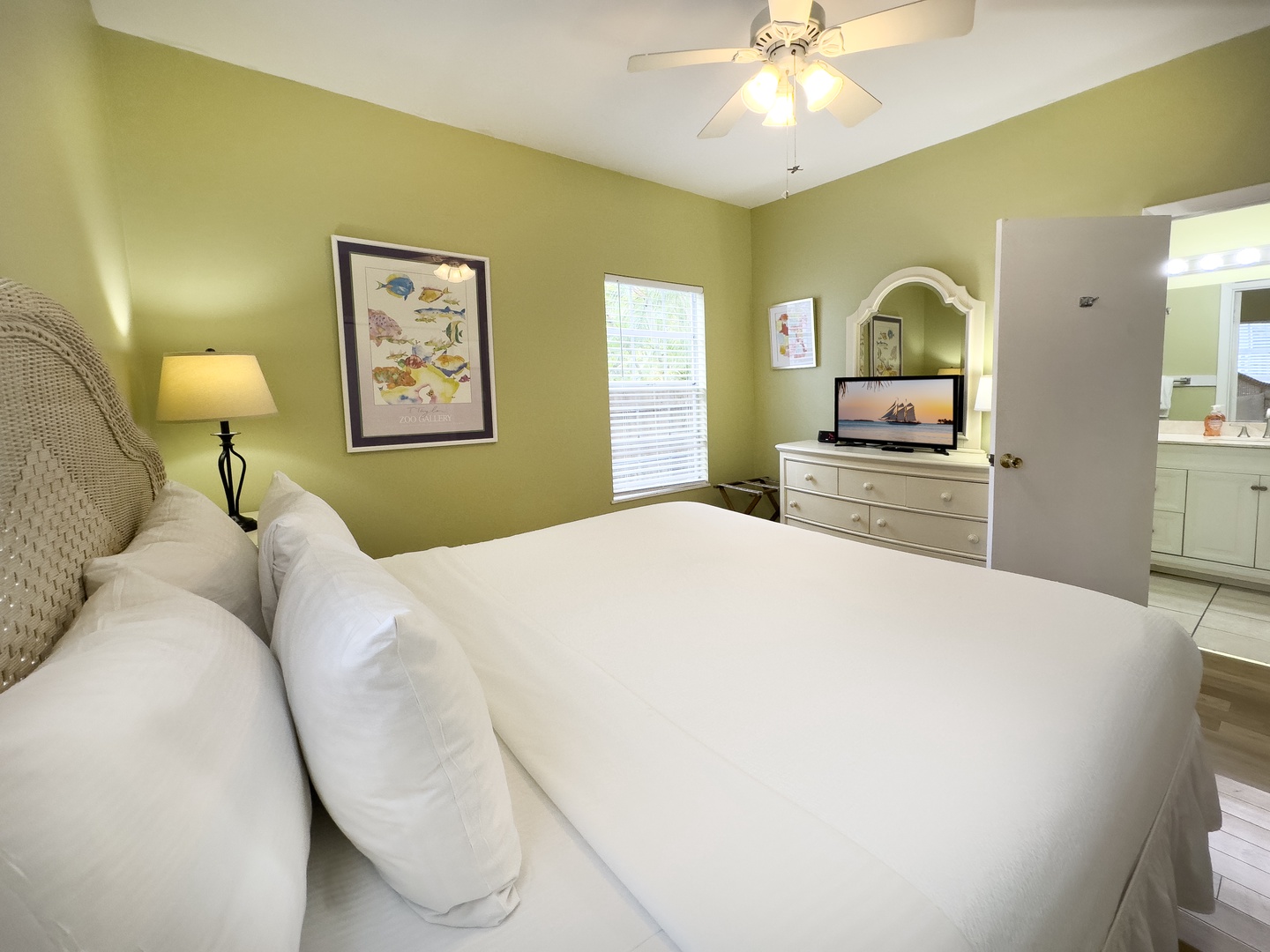 The Southern Cross has two bedrooms and two bathrooms. The main floor features a King primary suite, bathed in the iconic hue of key lime- the essence of Key West! This King primary has a large closet, a bureau with a mirror, a SmartTV, and an ensuite bathroom with a single-sink granite vanity and a tub/shower combo.