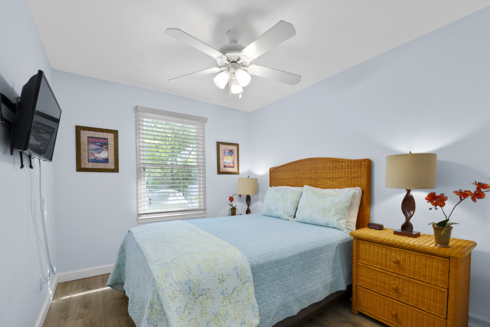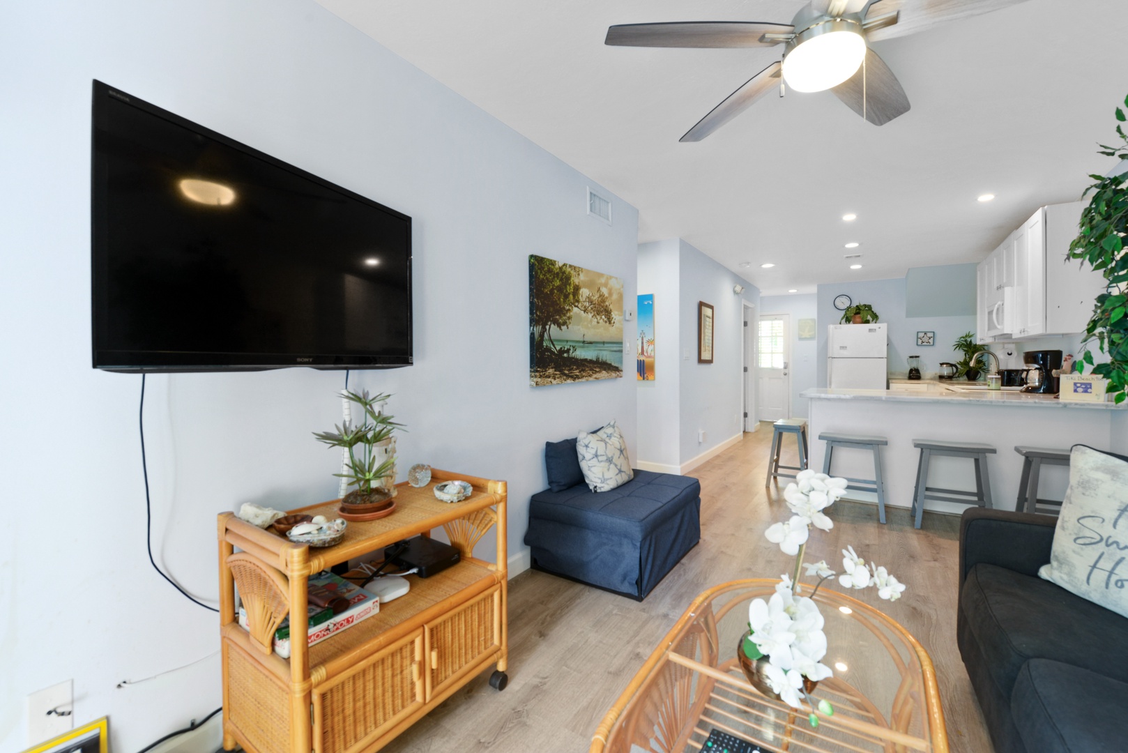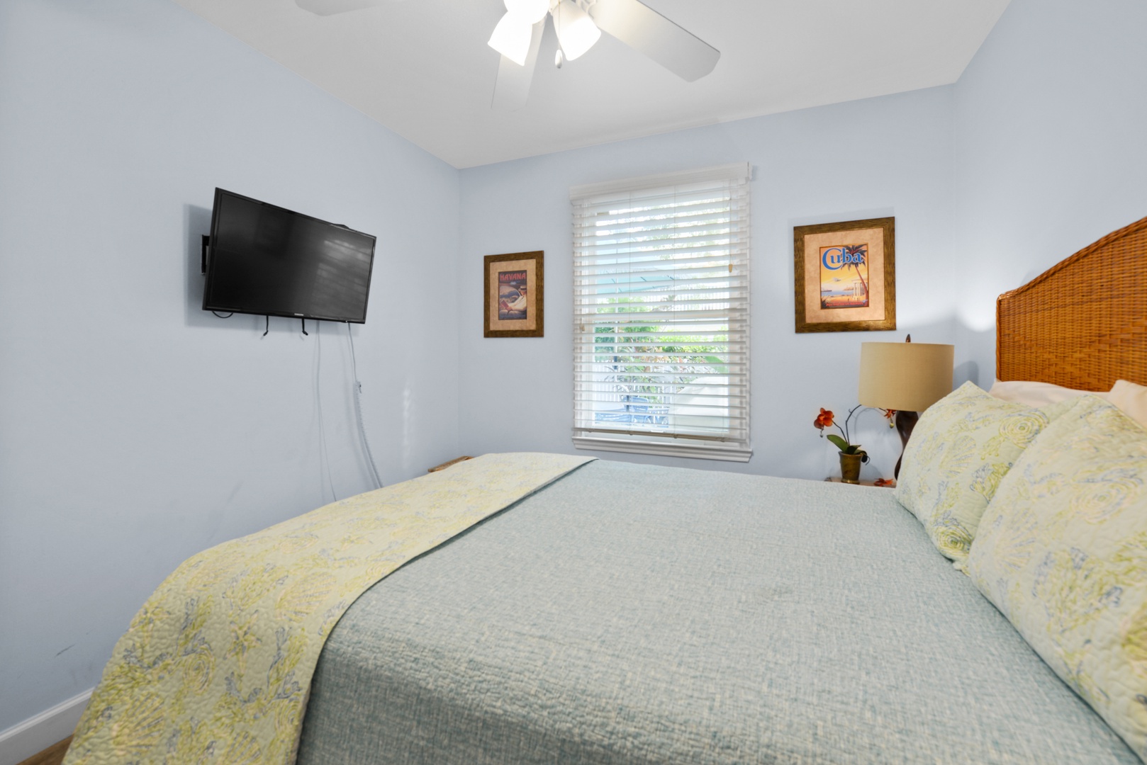Tiki Beach Too has two bedrooms with 1 King and Queen size beds. Each bedroom is set to be an oasis of tranquility, featuring plush bedding and soothing decor to ensure a restful night\'s sleep after a day of exploring Key West. The bathroom off the common space has a tub, while a full bath with shower is ensuite of the front bedroom. Both bathrooms are elegantly designed, offering modern amenities and a spa-like atmosphere.