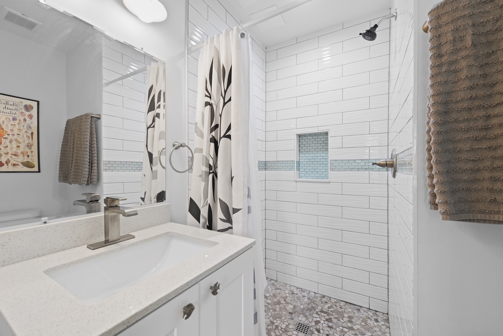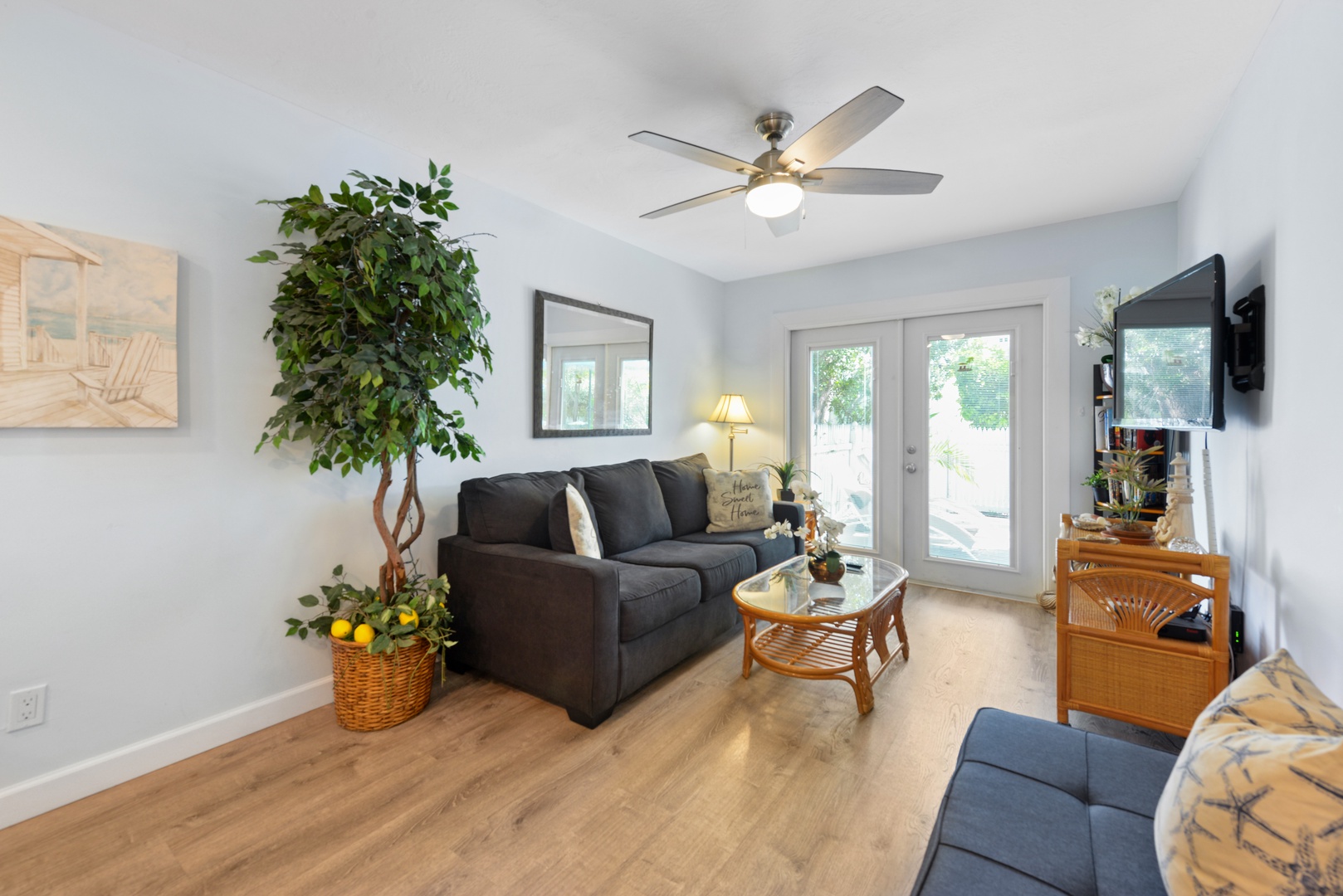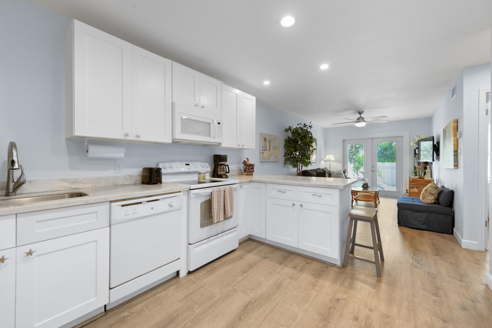 Tiki Beach Too has two bedrooms with 1 King and Queen size beds. Each bedroom is set to be an oasis of tranquility, featuring plush bedding and soothing decor to ensure a restful night\'s sleep after a day of exploring Key West. The bathroom off the common space has a tub, while a full bath with shower is ensuite of the front bedroom. Both bathrooms are elegantly designed, offering modern amenities and a spa-like atmosphere.