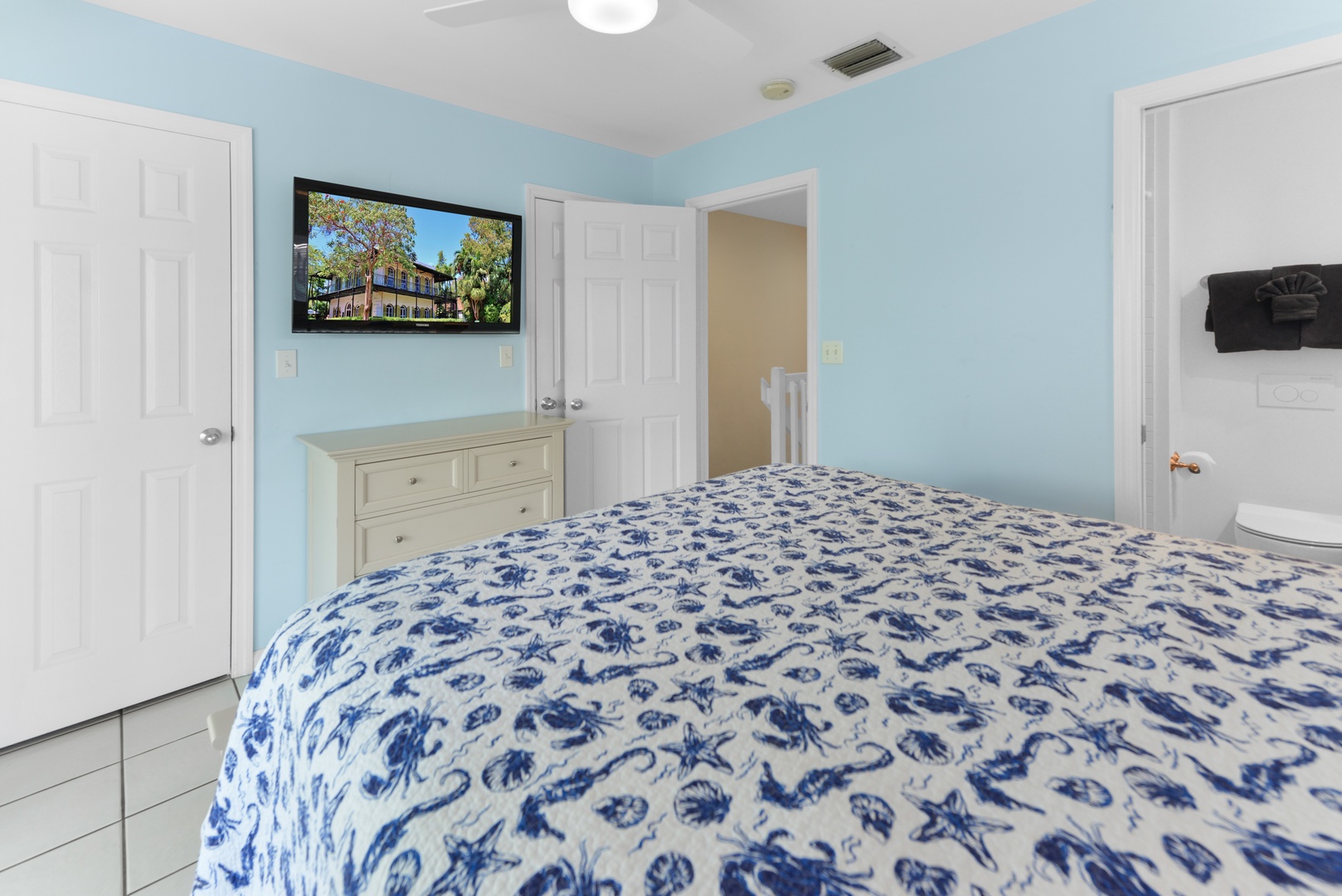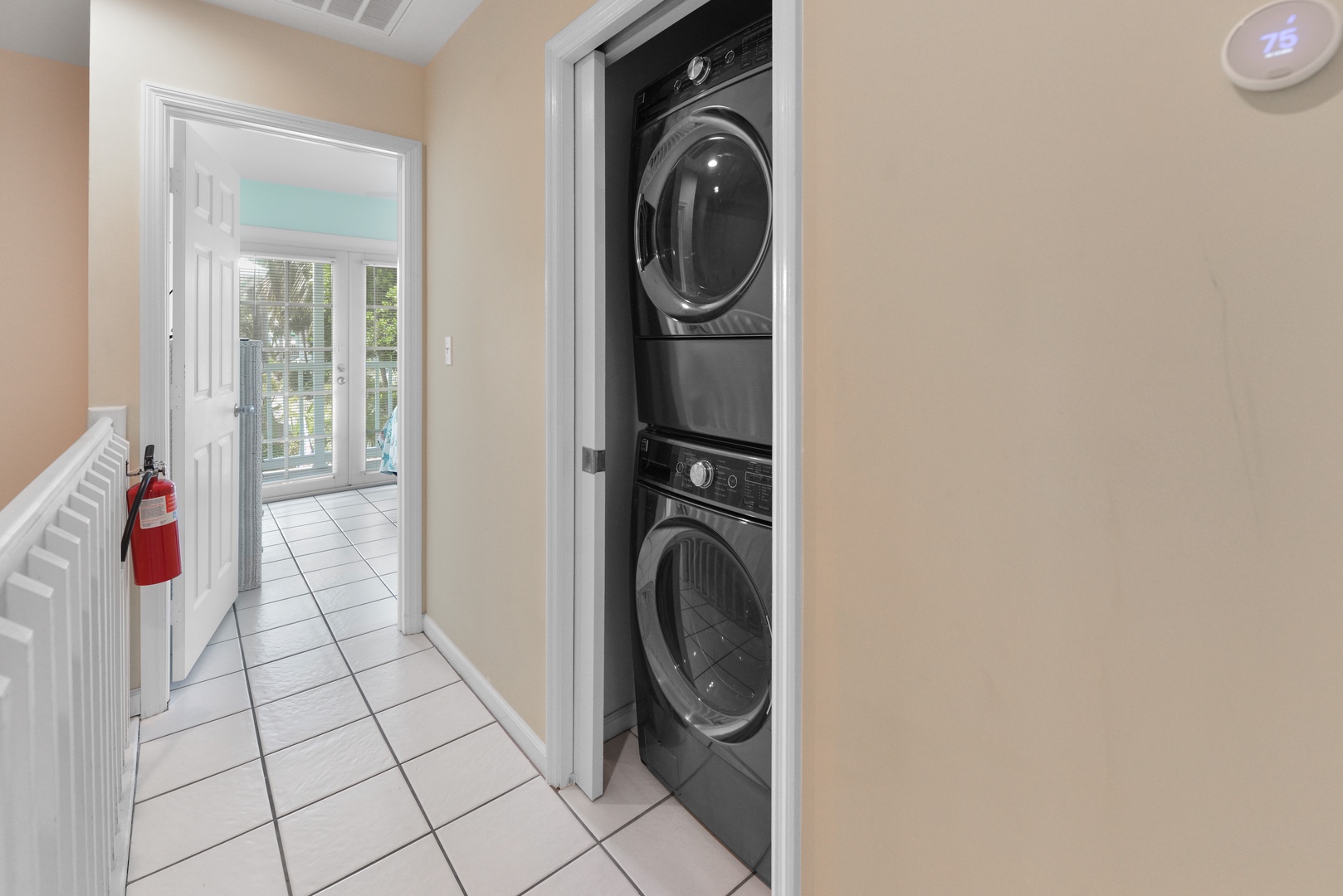 Upstairs are two bedrooms, both with ensuite bathrooms, queen beds, and ample closet space. Both bedrooms open to a covered porch with relaxed seating options. A washer and dryer are located in the hallway between the 2 bedrooms for your convenience.