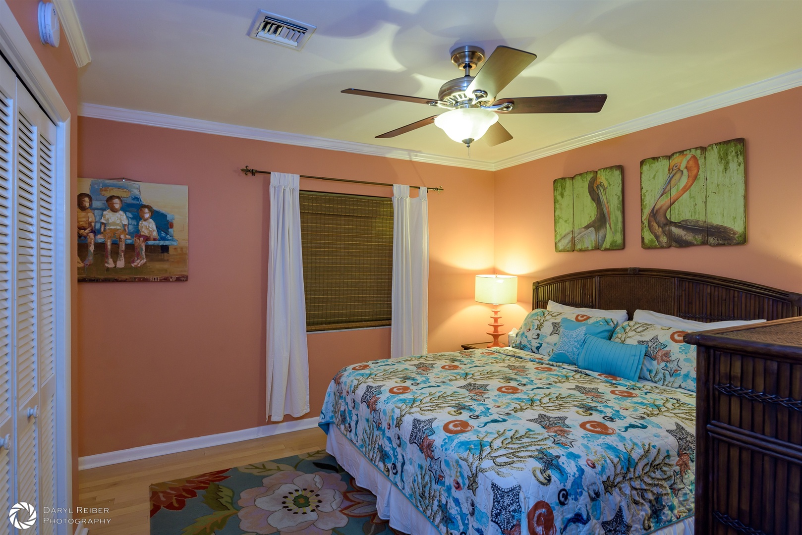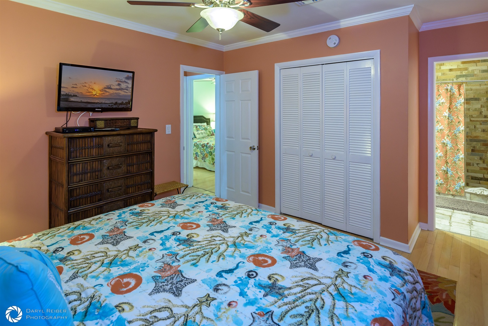 The primary bedroom in the rear of the home has an ensuite bathroom and king bed. The second bedroom has a queen bed and en suite bathroom. The third bedroom also has a king bed. All bedrooms have flat-screen TVs.