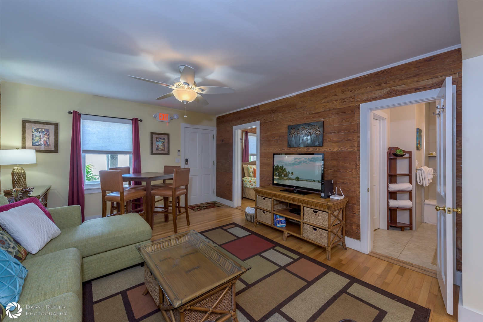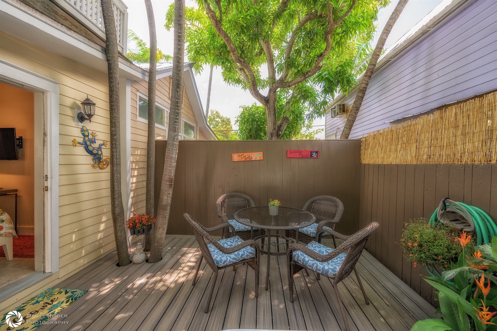 Eyebrow Suite is a spacious two-bedroom suite with one of the best locations on the island. Its large front porch and palm tree-filled fenced-in yard invite you to a private oasis on Olivia street, just a half block from Duval Street. You\'ll feel like a local as you sip a drink, read the newspaper, or just people watch from the front porch.