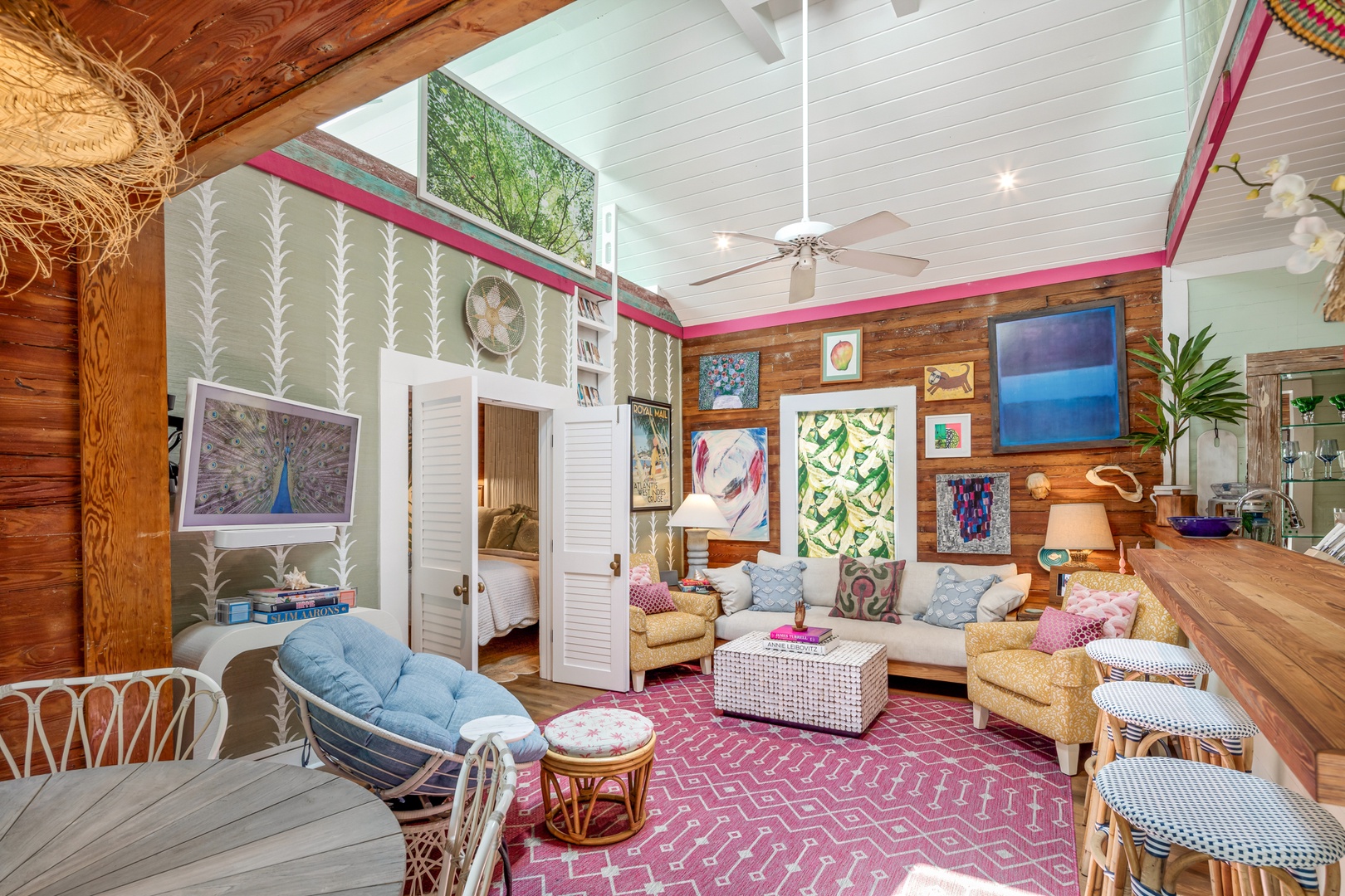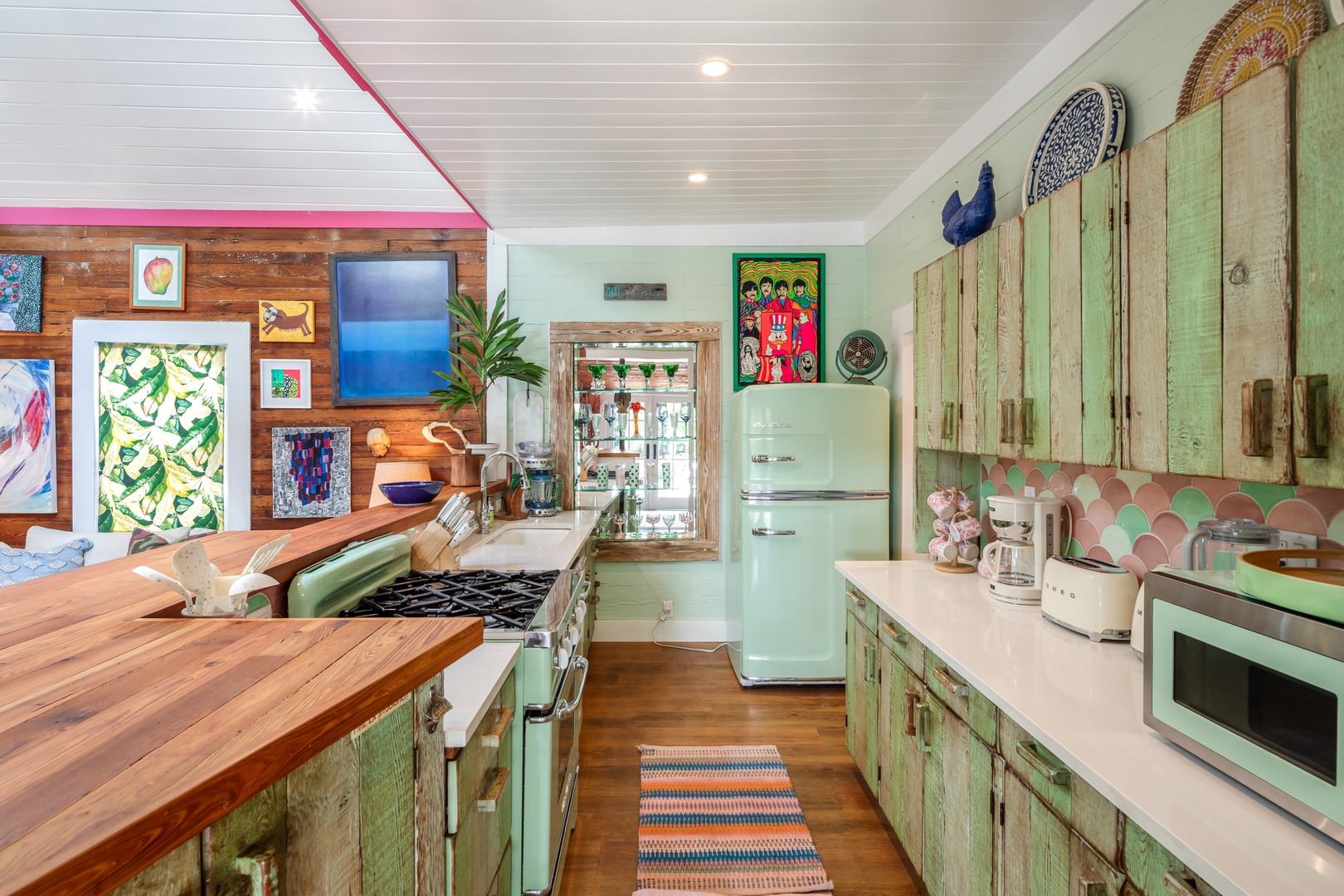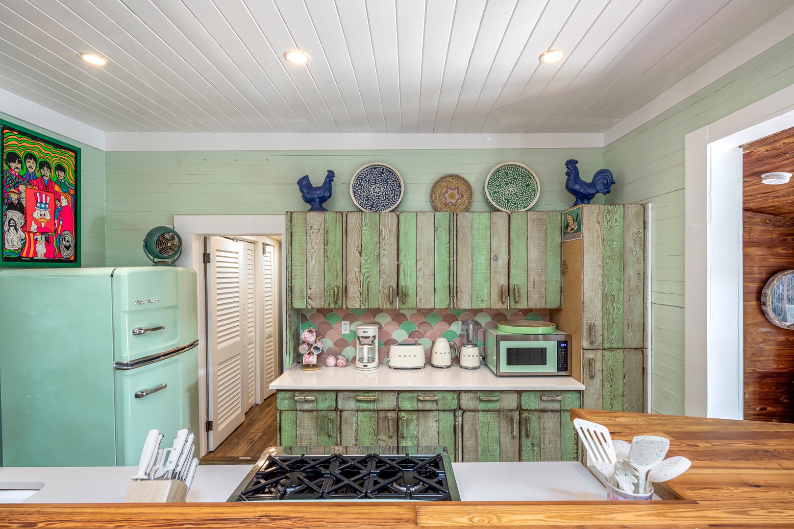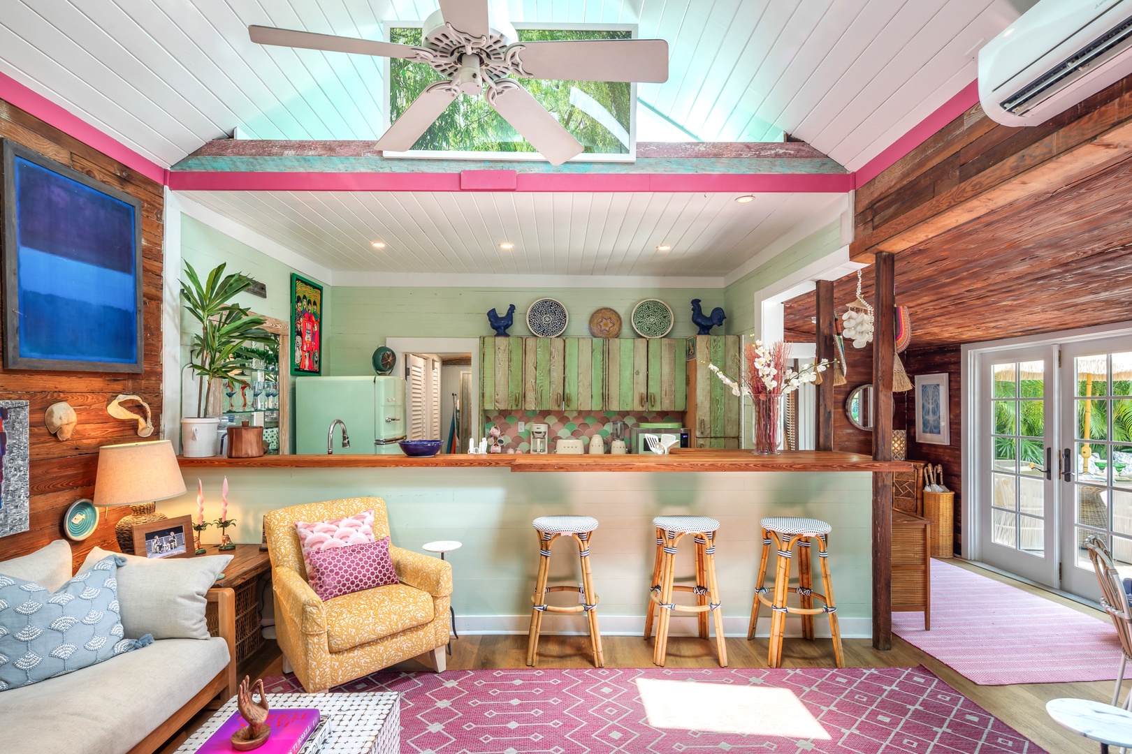 Step inside the French doors into the rustic charm of this cottage with its Dade County Pine walls and cathedral ceilings in the living area. All new flooring throughout the common areas compliment the wood walls. The kitchen has retro style appliances, quartz counters and mosaic backsplash that retain the character of the house. There is a laundry room just beyond the kitchen.
