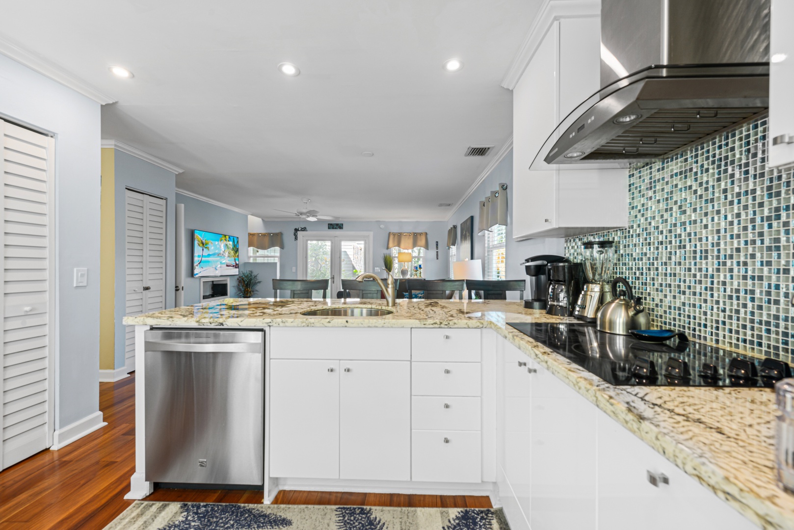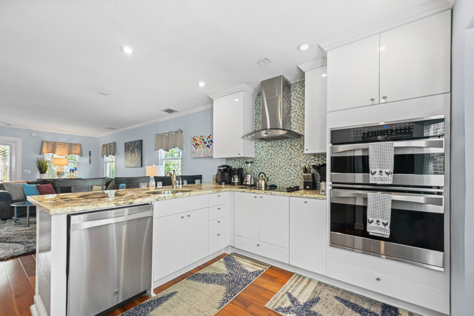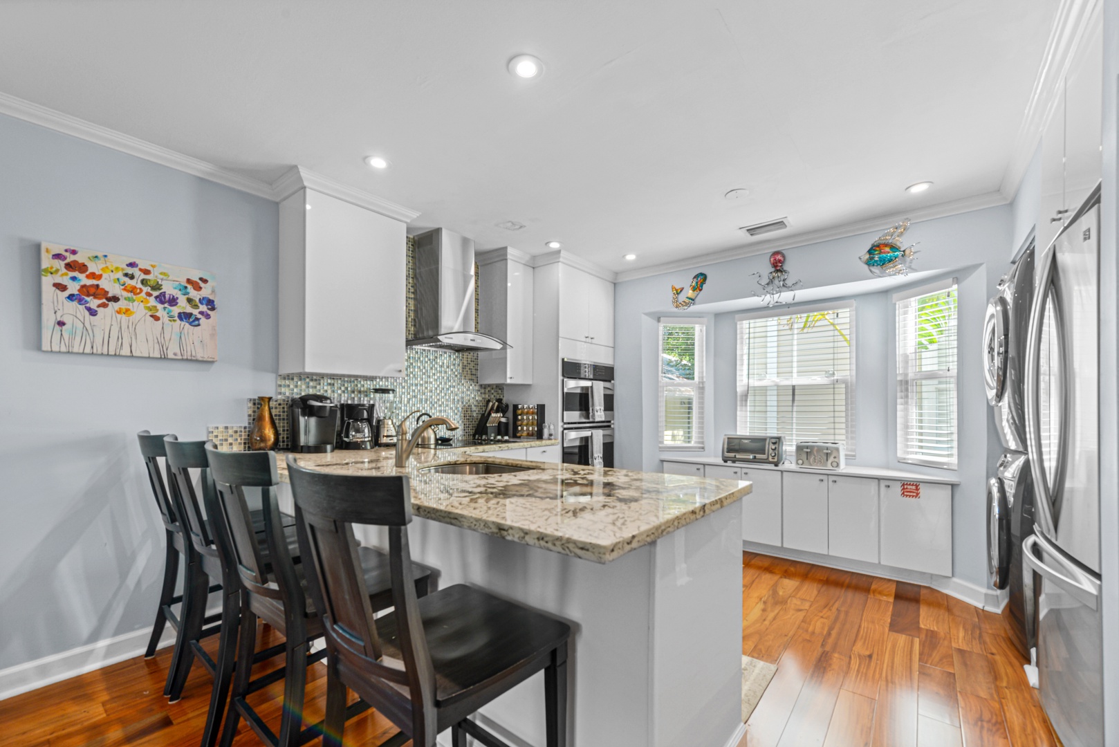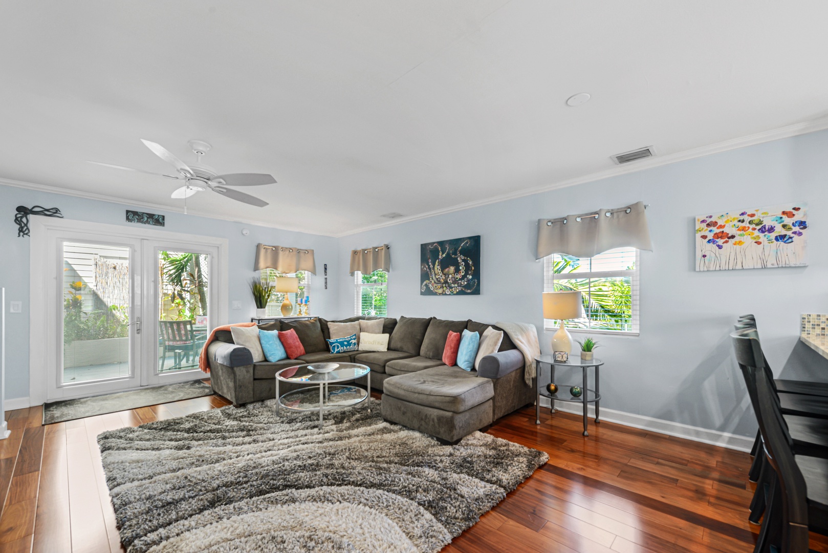 The downstairs living area is decorated with warm wood floors, blue and sand accents and provides plenty of space for entertaining. French doors lead out to a large covered and private patio area. The kitchen features modern appliances, clean white cabinets and a dramatic granite countertop that seats four for dining.