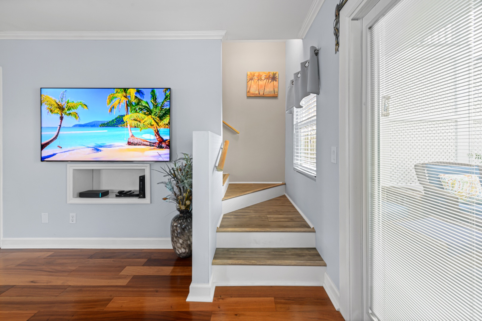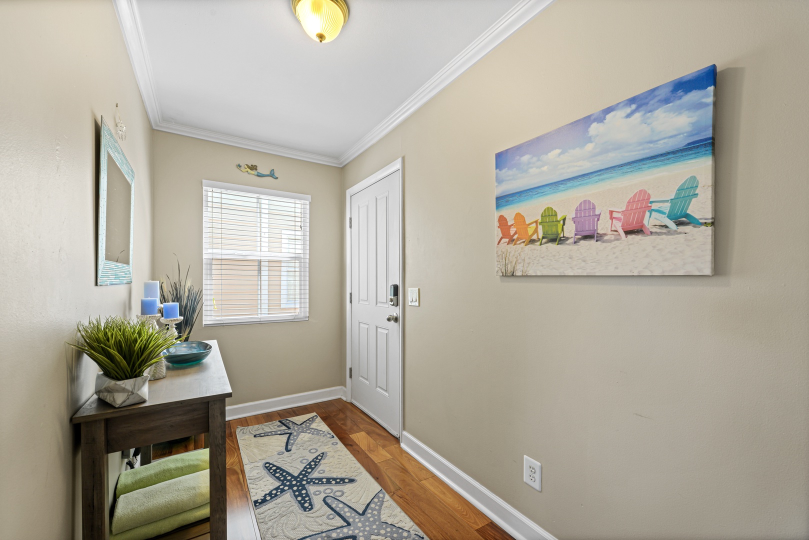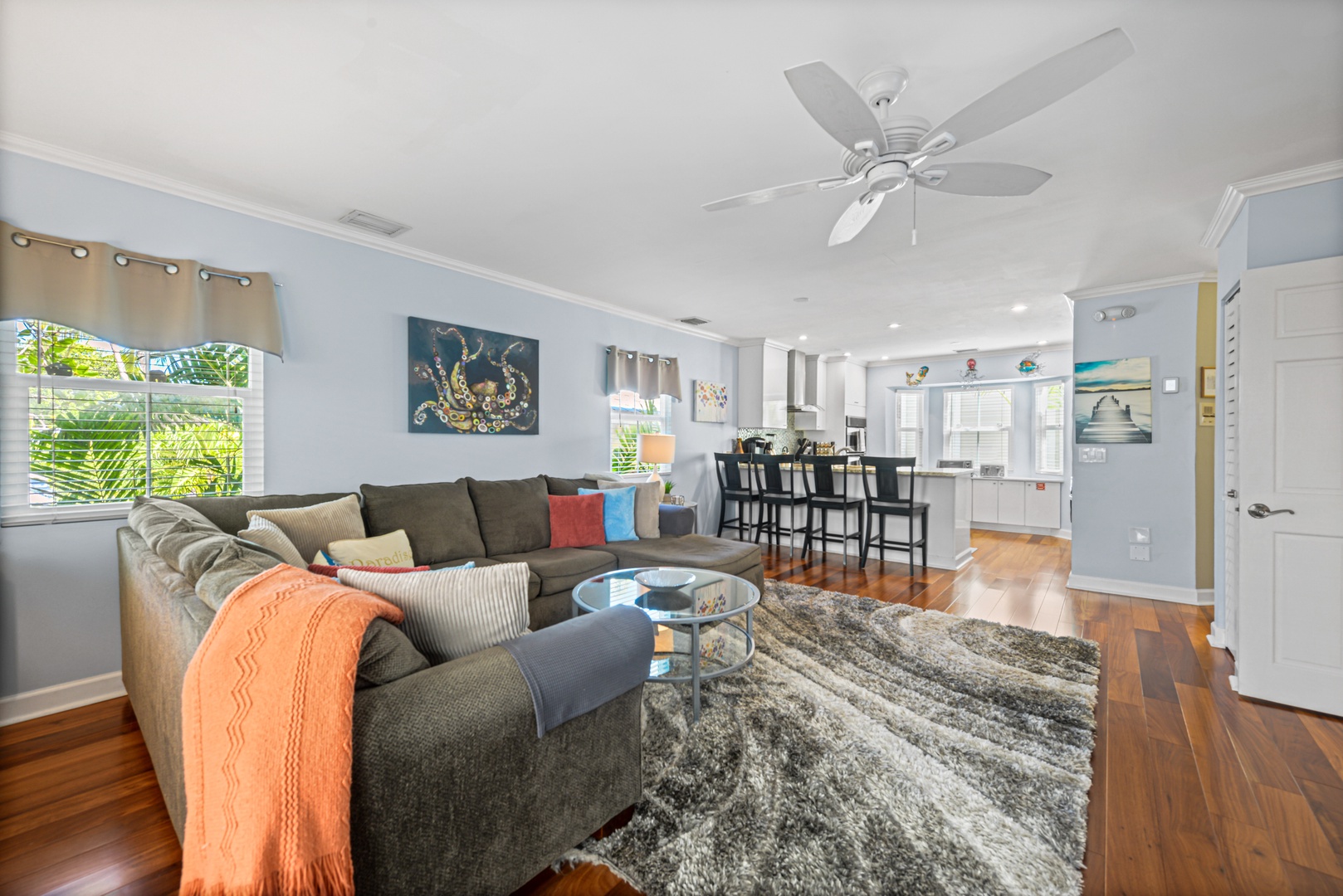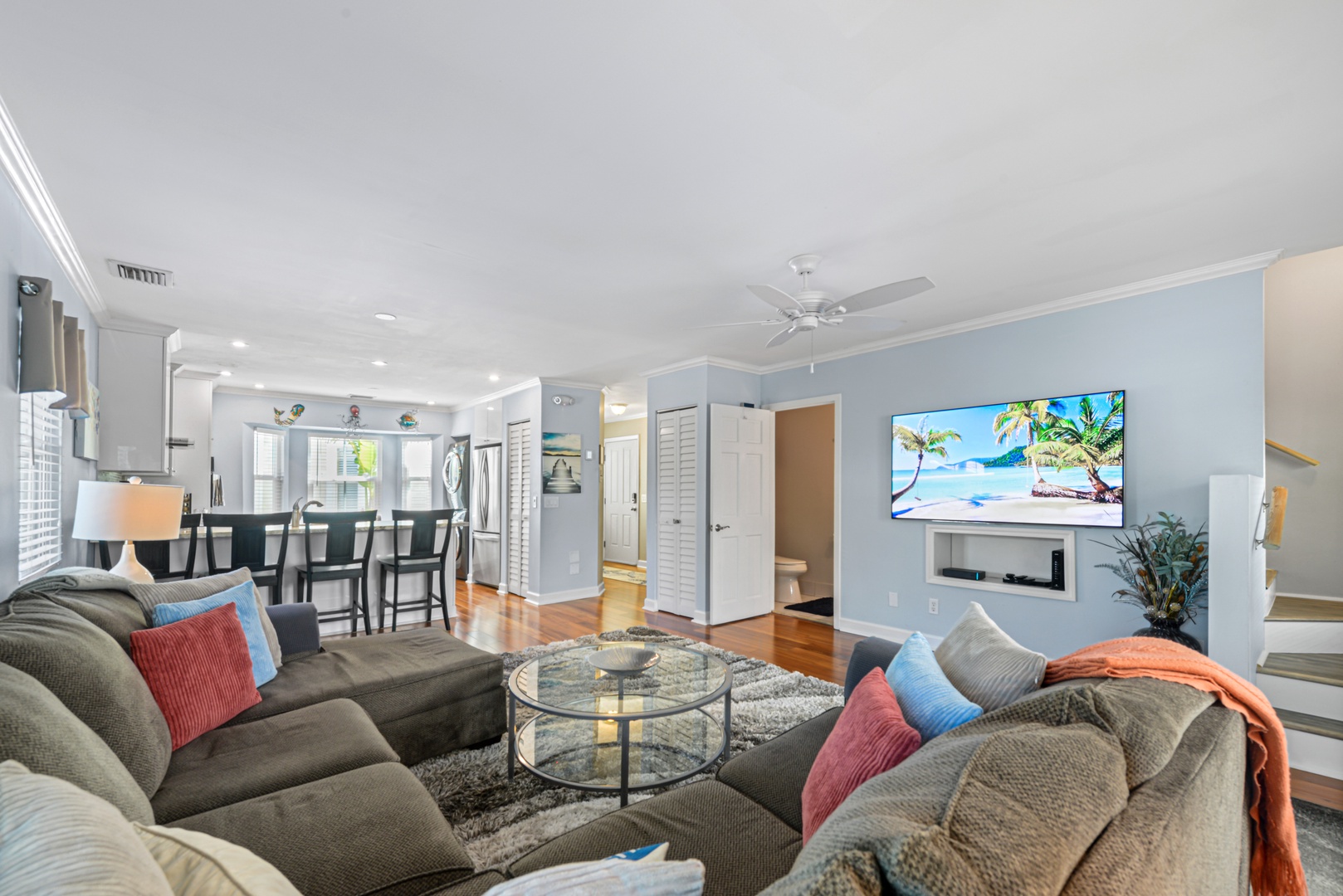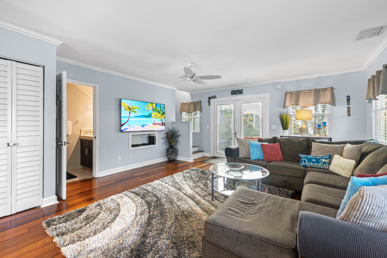 The downstairs living area is decorated with warm wood floors, blue and sand accents and provides plenty of space for entertaining. French doors lead out to a large covered and private patio area. The kitchen features modern appliances, clean white cabinets and a dramatic granite countertop that seats four for dining.