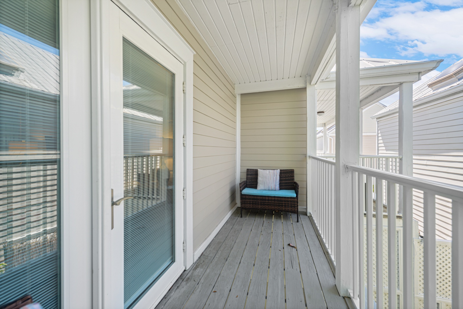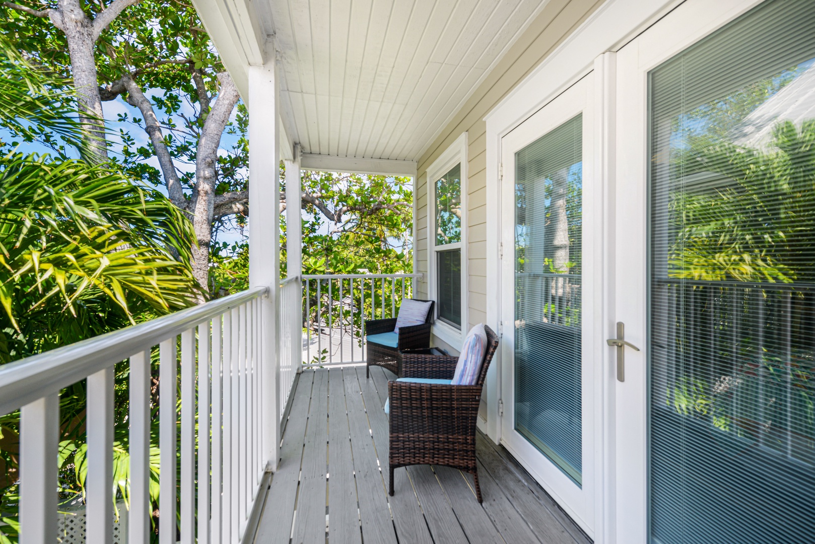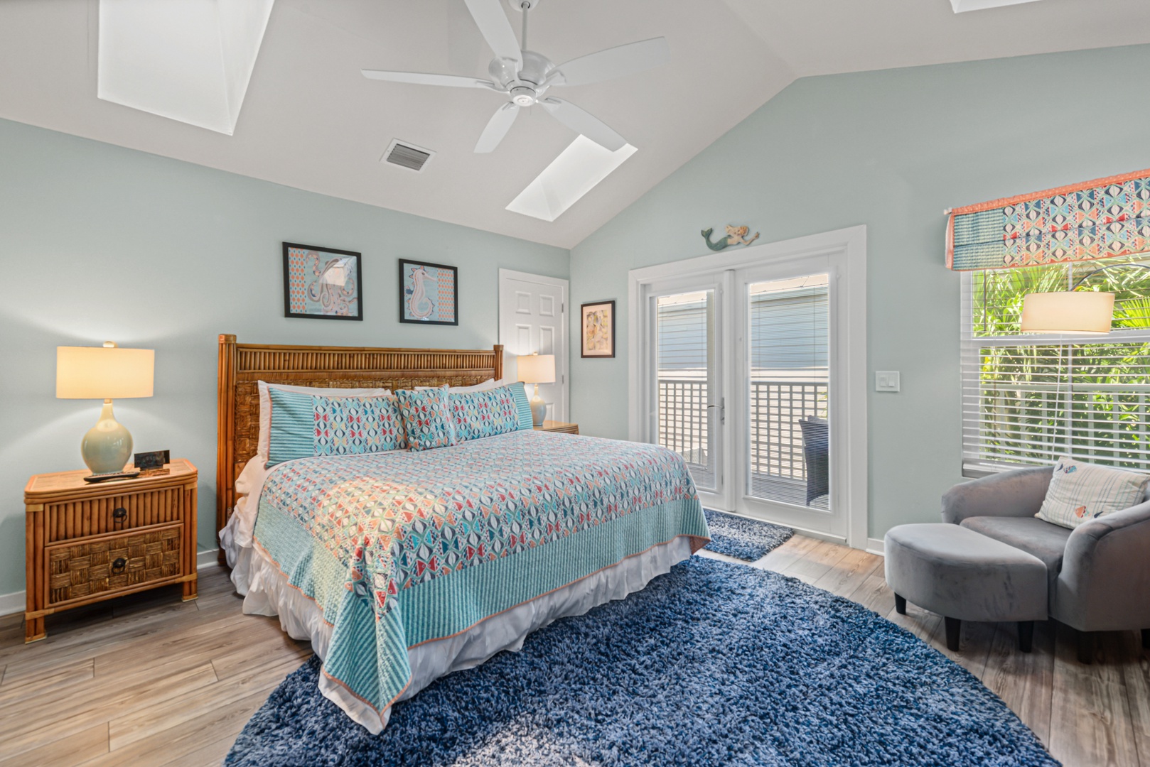 Upstairs, the primary bedroom is a calming oasis of ocean blue green accents. A spa-like ensuite bath features a large step in shower and generous vanity. A second balcony provides a private outdoor space to enjoy your morning coffee. The second bedroom features a queen size bed and another ensuite bath.