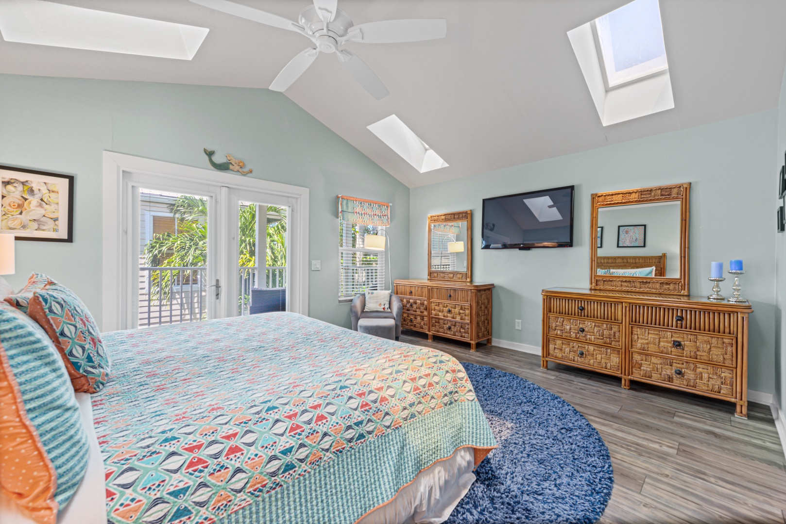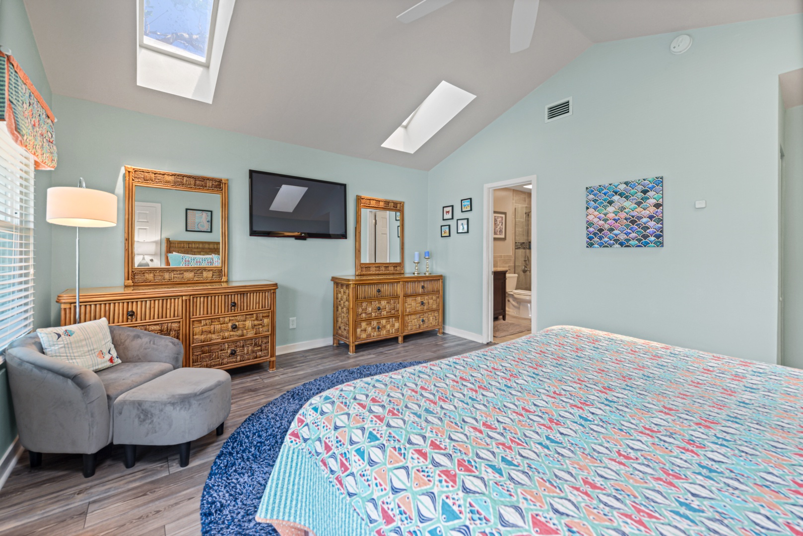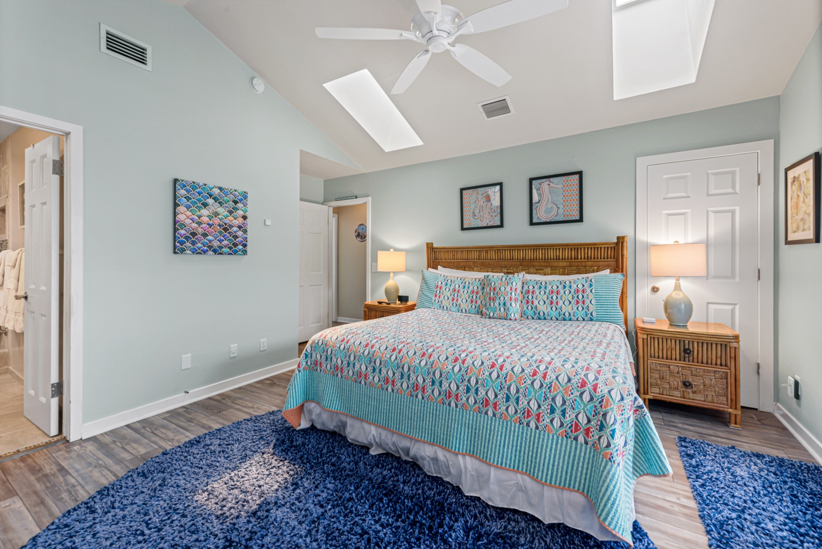 Upstairs, the primary bedroom is a calming oasis of ocean blue green accents. A spa-like ensuite bath features a large step in shower and generous vanity. A second balcony provides a private outdoor space to enjoy your morning coffee. The second bedroom features a queen size bed and another ensuite bath.