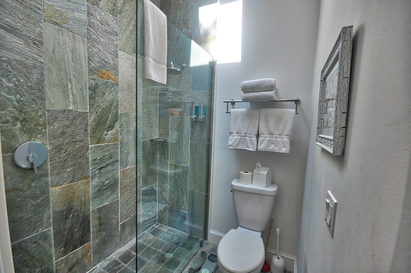 Enter the home and fold the doors away for a totally open indoor/outdoor living environment. The open floor plan of the living, dining and kitchen is beautifully designed with comfortable yet classy furnishings. Set against a backdrop of gray washed wood walls with just the right pops of color, the space sets a totally relaxing mood. A sparkling white kitchen is refreshing to the eye and super functional (including drip coffee maker). Bedding: 3 kings