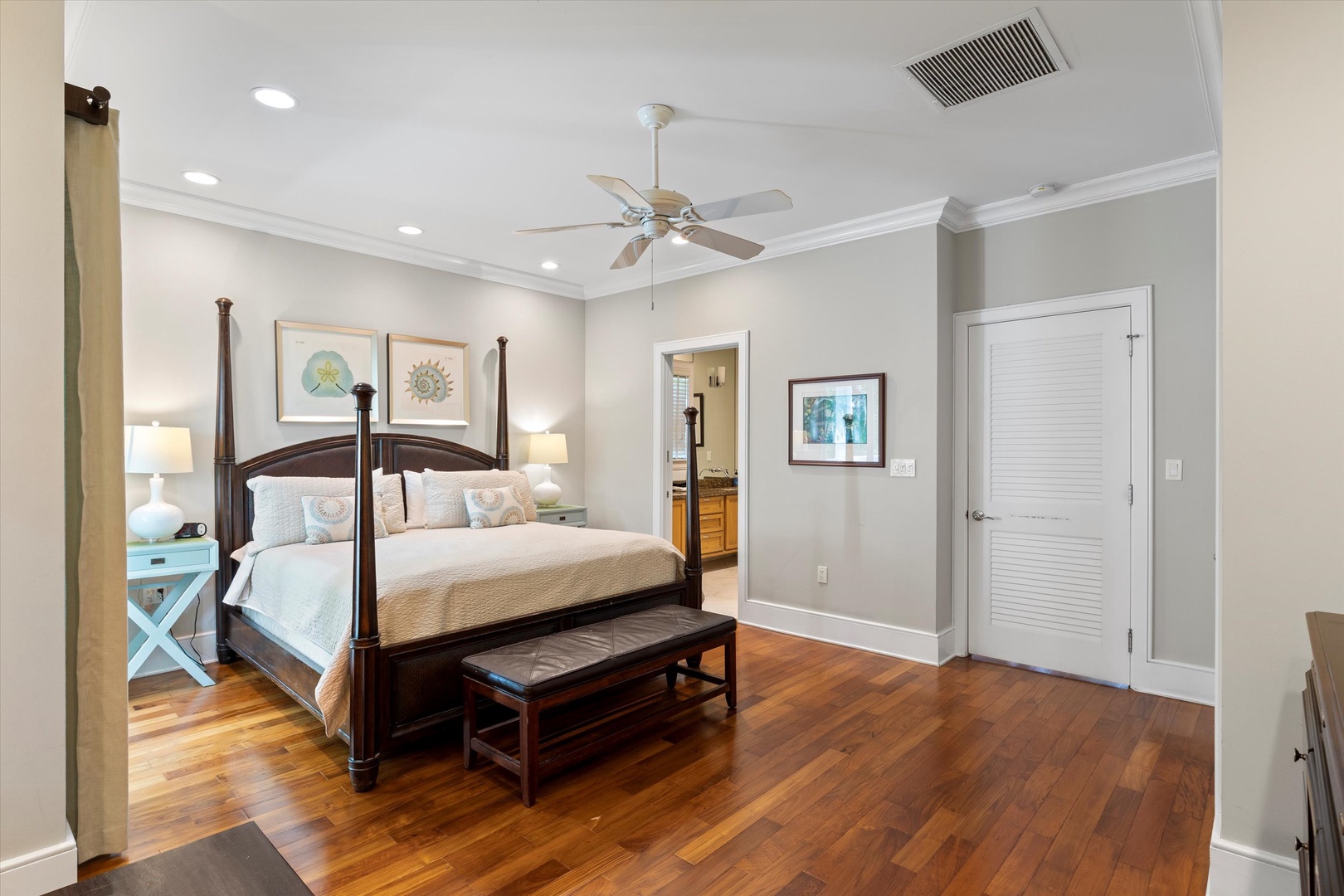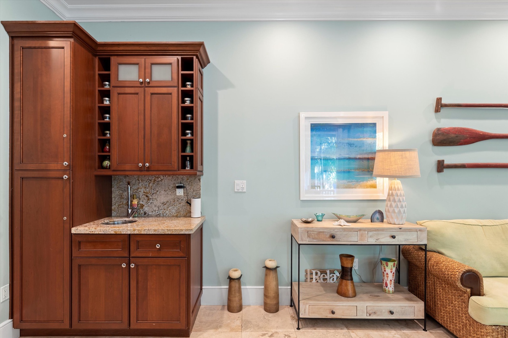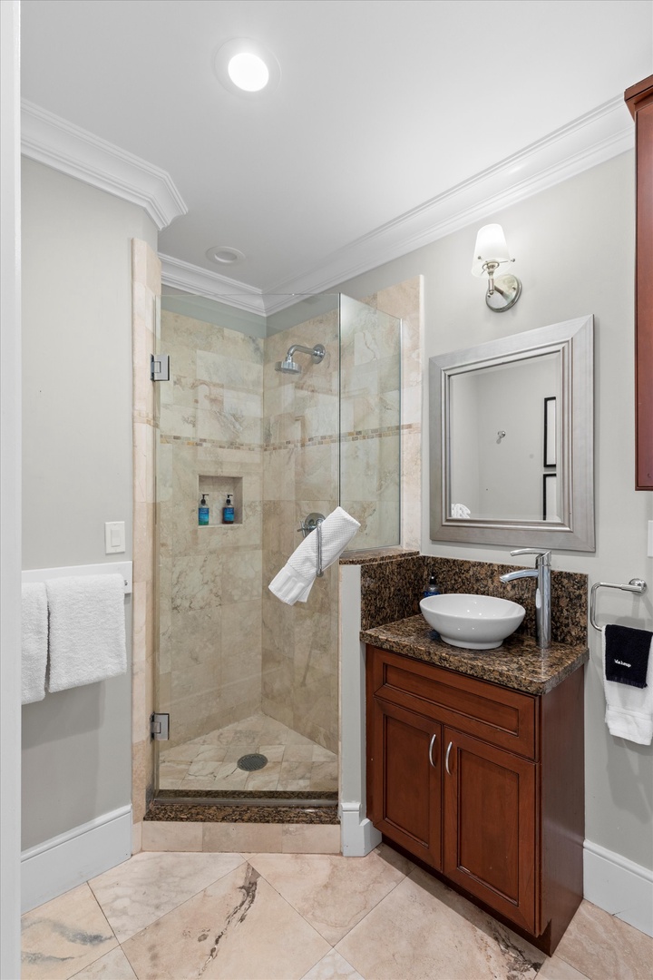These beautiful villas boast over 1700 sq ft. on two levels for your vacation destination, with it’s own private garden with heated pool. The open living/dining area features comfortable sofas and chairs, and a dining table to seat six. Just off the living room is your complete and fully-equipped modern kitchen with top-of-the-line appliances and a center island/bar. The half-bath is situated in the hall between the foyer and kitchen. Sliding doors open from the living area to a deck and the pool edged by variety of tropical plants. An inviting deck surrounding the pool provides atmosphere for peaceful conversation and relaxation after a day of sightseeing. One bedroom is on the first level with a queen bed and en-suite bath with shower only. The second level of the house offers two bedroom suites with en-suite bathrooms. The bedrooms are expertly decorated to offer luxury without being overbearing. Spacious and plush, the main suite has an elegant king bed and a grand tiled bath with his-and-hers sink and large shower. The second bedroom has two twin beds with luxurious linens and an en-suite bathroom with tub.