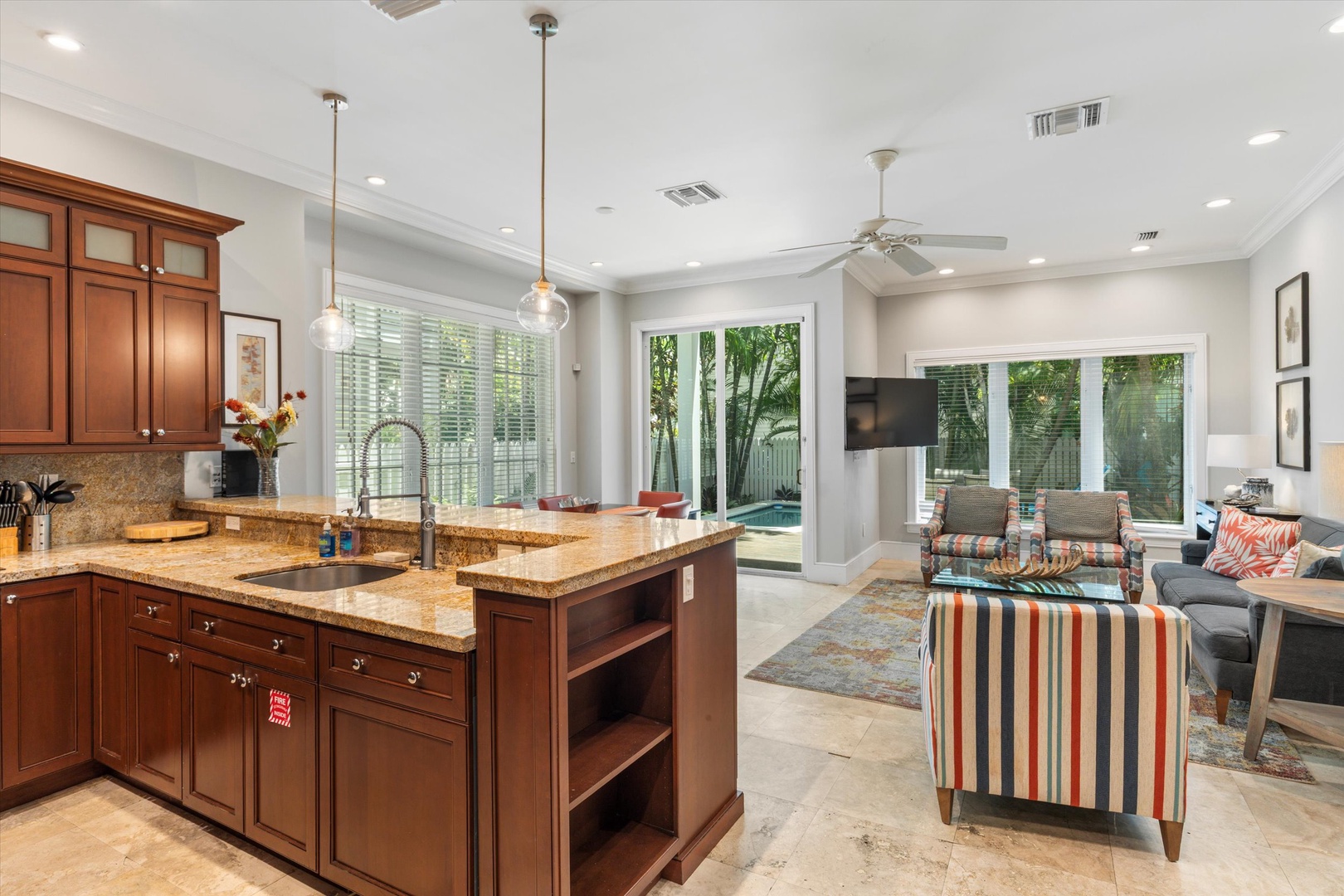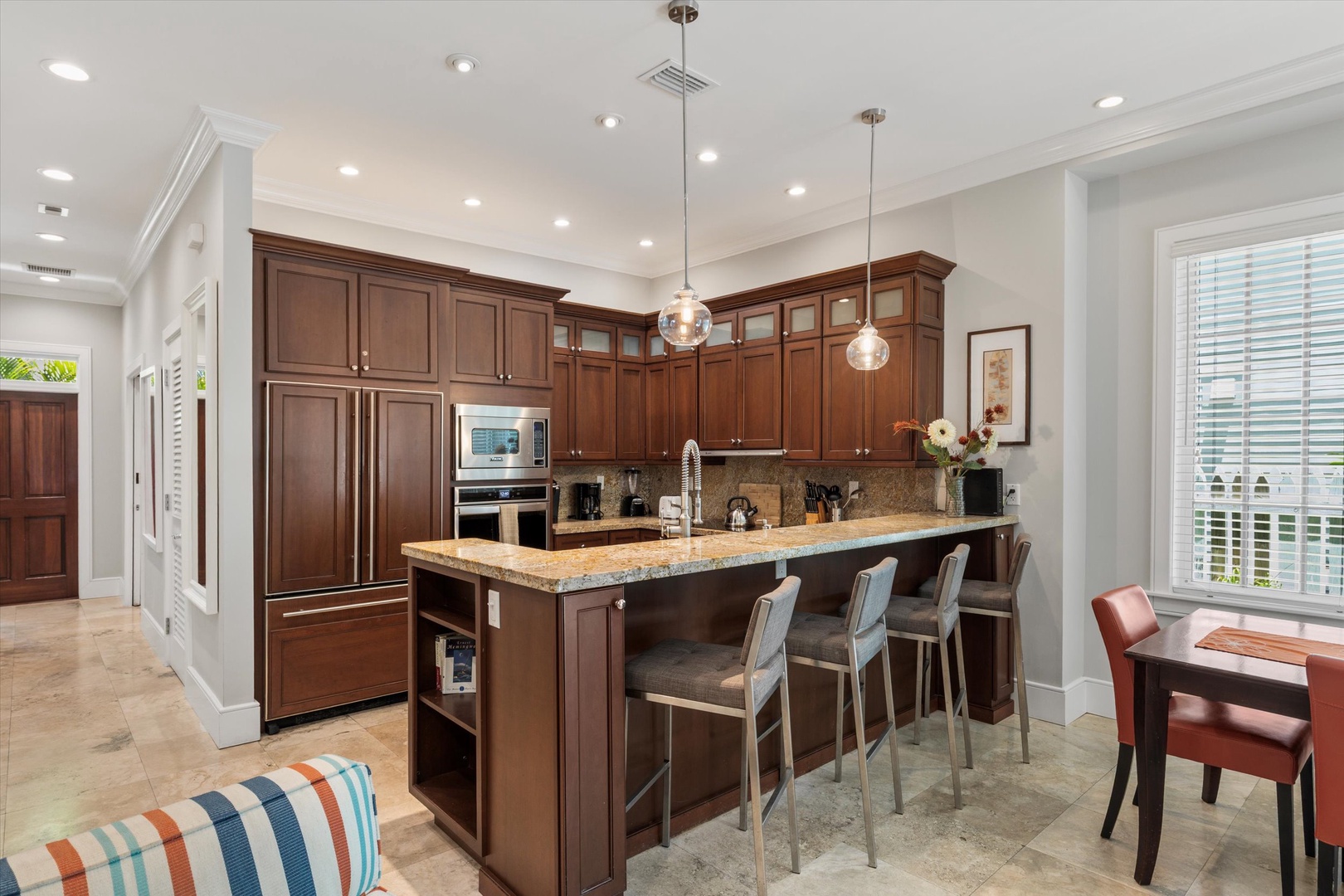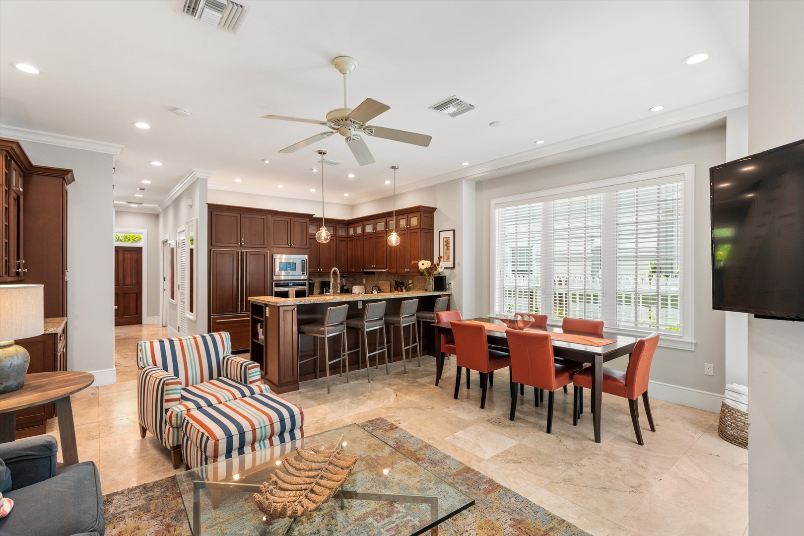 Windsor Townhomes #3 consists of three ensuite bedrooms, a modern kitchen with high-end appliances, and a generous dining room and family room. The kitchen is fully equipped and has a granite counter and bar top for prepping. Morning coffee may be made using the Keurig or the regular drip coffee maker. The openness of the family room, dining room, and kitchen offers a fantastic space for family and friends to gather before and after experiencing the wide array of activities offered in Key West.
