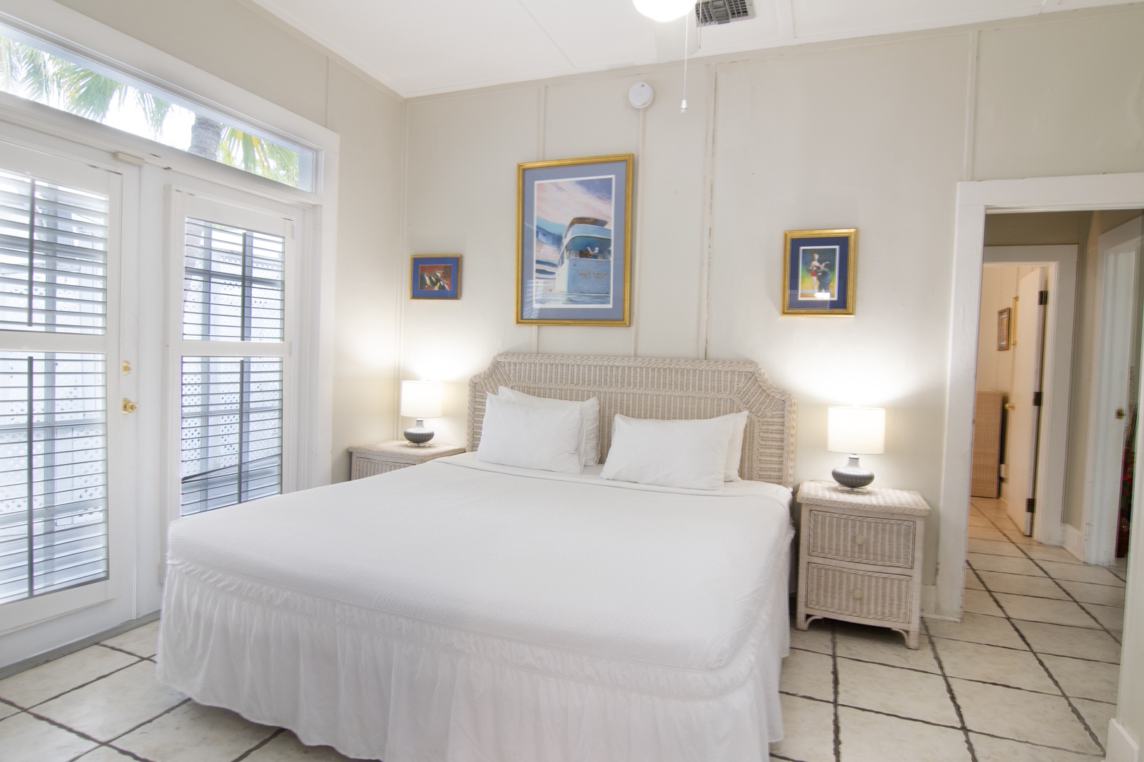 This charming cottage is set back from the street and shaded by gardens, mature palms, and gumbo limbo trees in a quiet, upscale, gated complex of six historic Old Key West vacation rentals. The spacious pea-gravel courtyard boasts tropical landscaping, coral and rock hardscaping, and stone walkways leading to the shared pool area. The central common area, with a pool, picnic tables, and gas grill, is shared by guests of this upscale 6-plex. There’s also a shared laundry area with commercial washers & dryers.