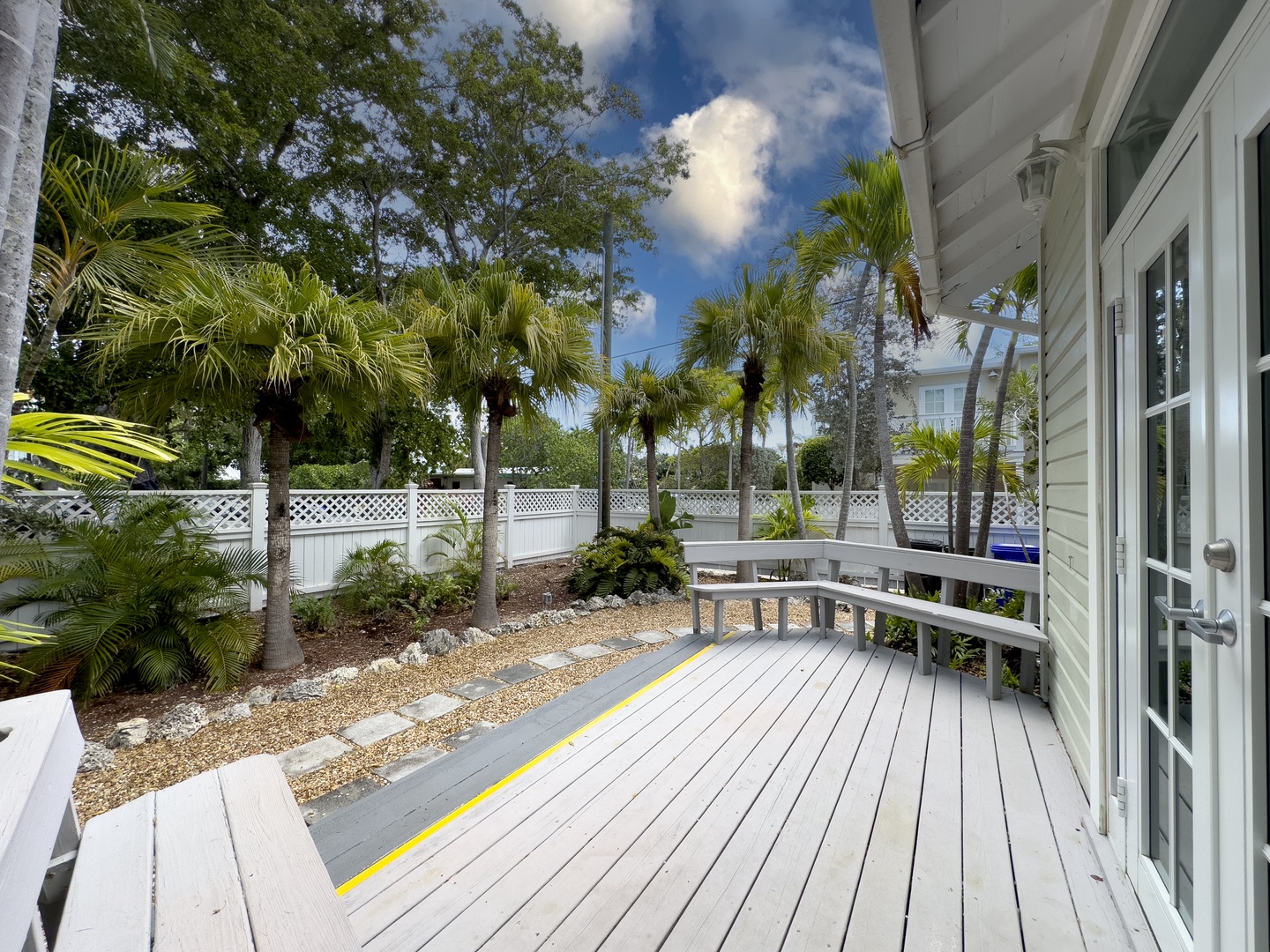 A tall exterior fence, lush gardens, and mature trees provide privacy, security, shade, and a peaceful, tropical ambiance. Enjoy a private dining space on your fenced side deck. This dining space seats six. The front deck, with built-in benches, is an idyllic spot for entertaining and socializing. A garden courtyard and whitewashed fencing buffer your private space from the central common area.