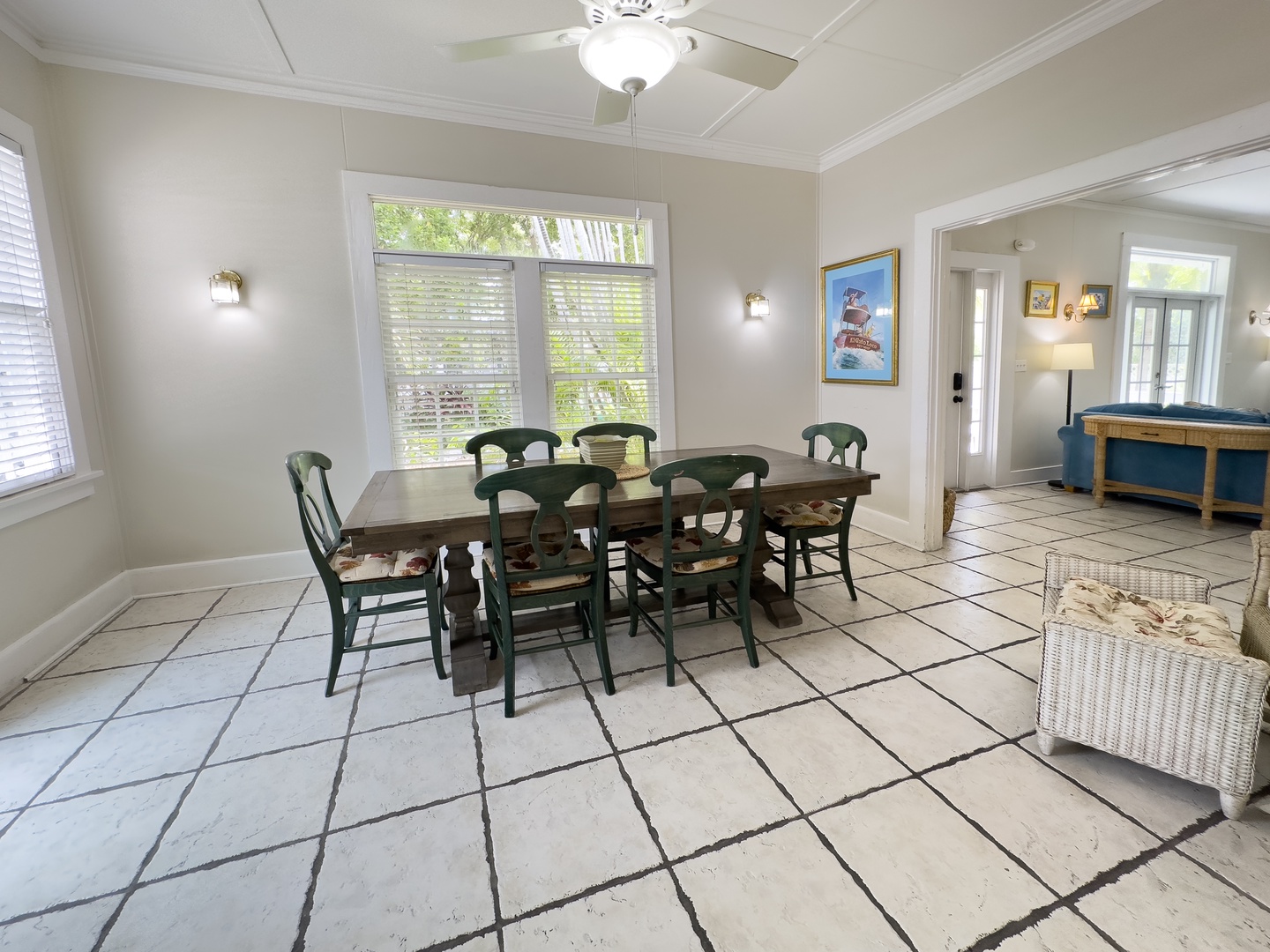The indoor dining room has tile floors, a ceiling fan, grand windows, and a solid yet rustic farmhouse-style dining table with seating for eight.