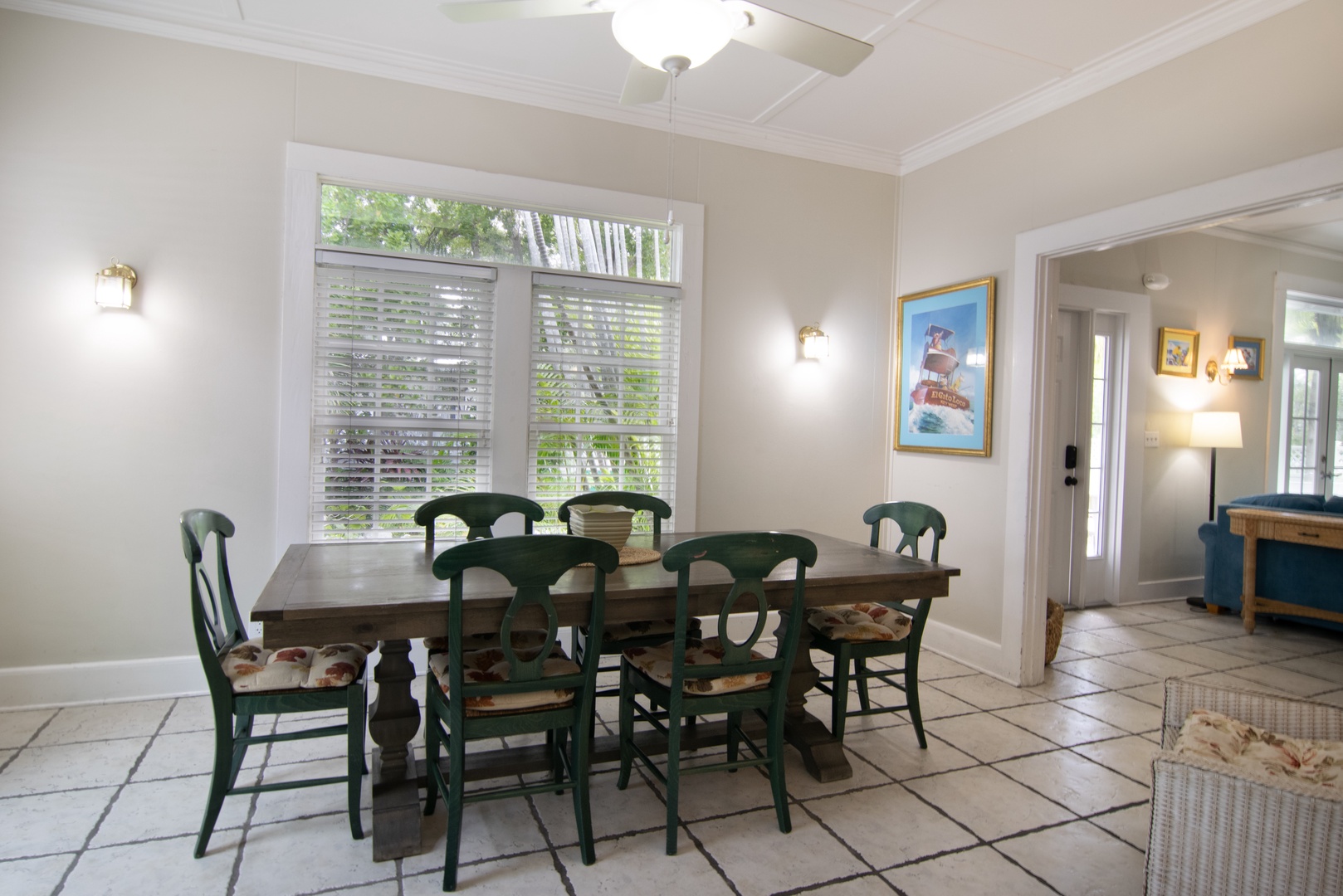 Toon Hall is a quintessential 1930s-era Conch home, lovingly renovated with contemporary island sophistication. A parquet brick walkway leads from the garden gate to the columned front entry of this iconic tropical retreat. The sage-green exterior blends Caribbean, Victorian, and contemporary influences: crisp white trim, detailed woodworking, and abundant windows.