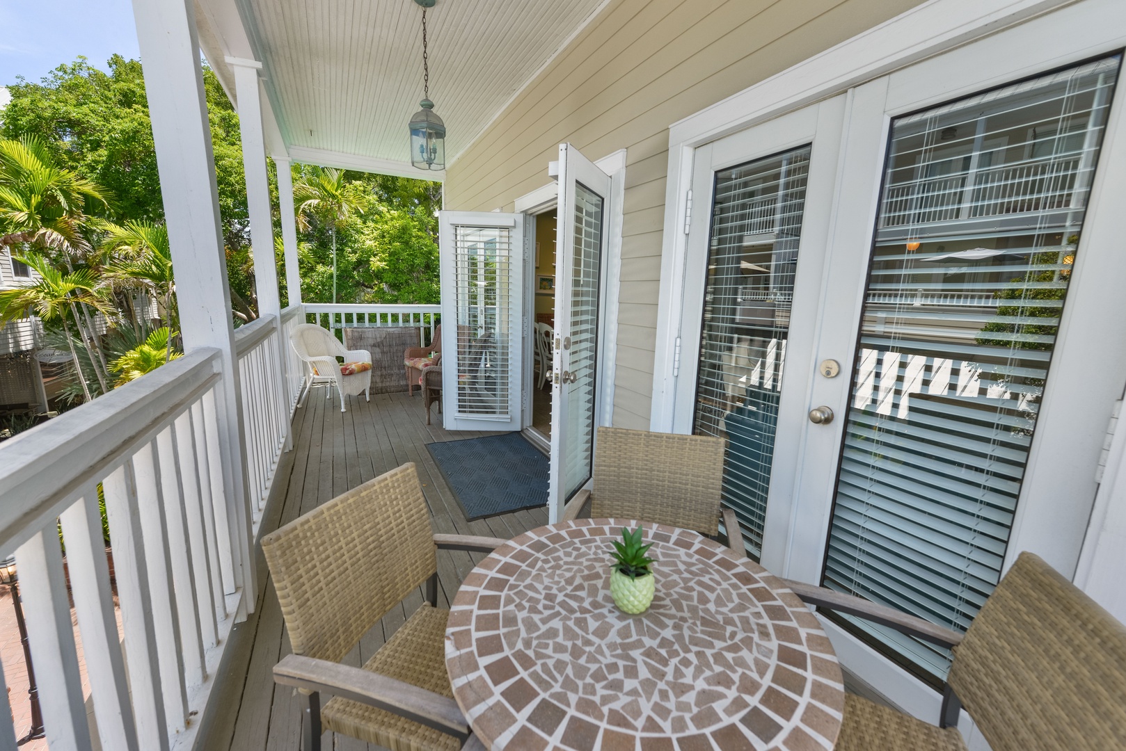 You enter a large open living, dining, kitchen area with French doors and balcony overlooking the courtyard below. The main bedroom with ensuite bath has a king bed and access to a second deck area overlooking the courtyard. There is a shared pool and sunning area that overlooks the world famous Duval Street just across the courtyard. This condo offers central air conditioning/heat and one reserved parking space in the gated garage. PLEASE NOTE THIS PROPERTY IS ACCESSED BY STAIRS ONLY.