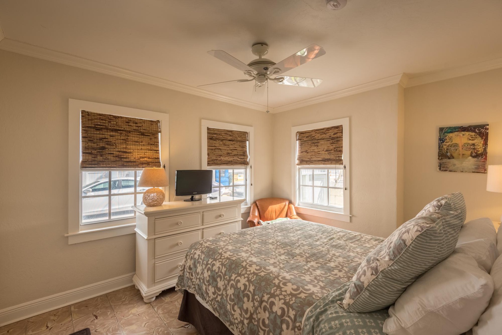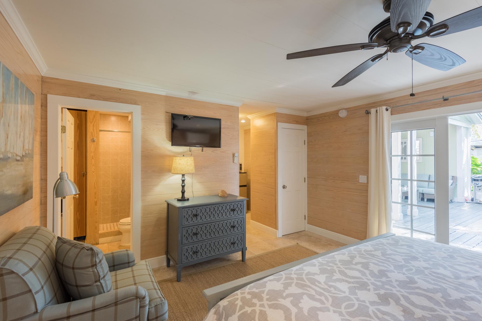 Directly off the pool is the cottage and its first-floor guest suite. French doors open to the bedroom suite with king bed, kitchenette and ensuite bathroom. Stairs from just outside the gates provide access to the second floor bedroom suite. A king bed, separate sitting area with television and full bath provide the perfect getaway.