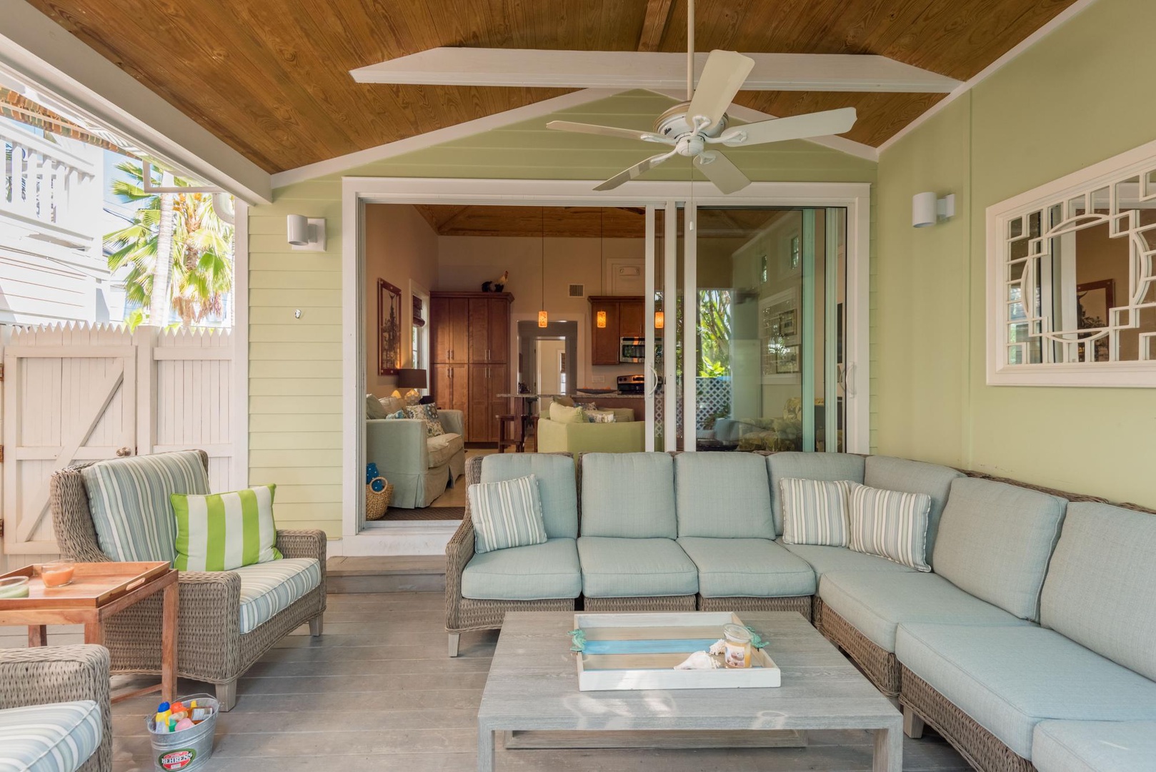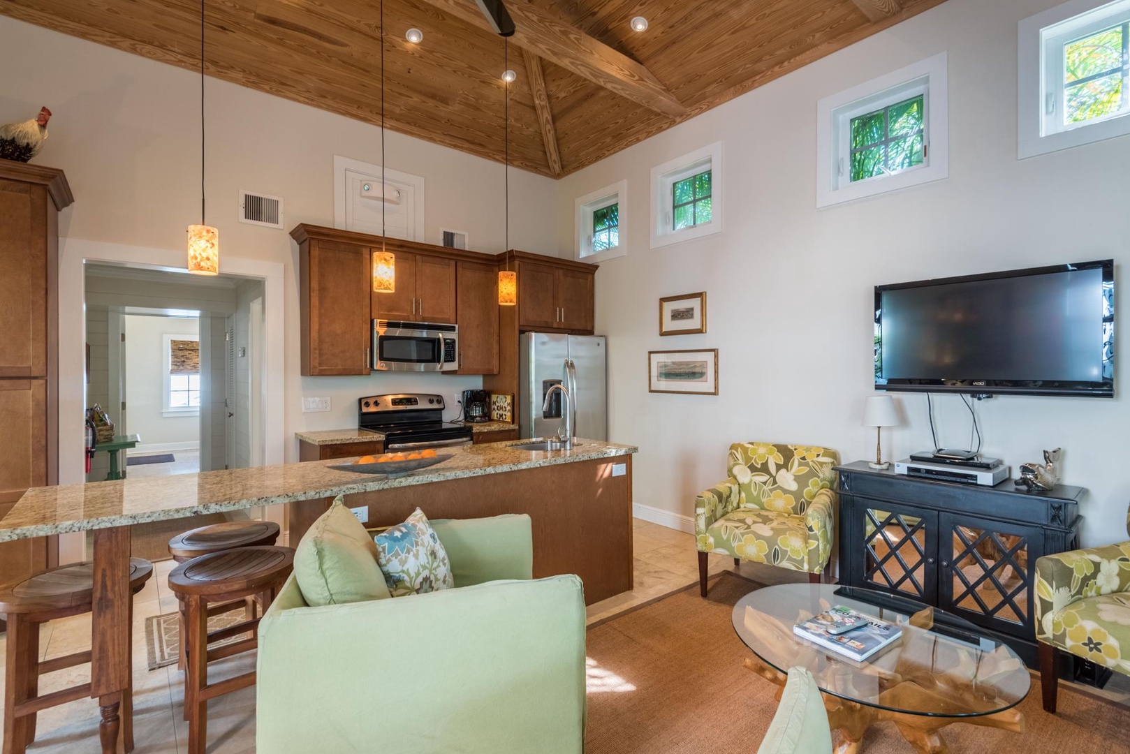 Enter the home into the great room and kitchen. Cathedral, pine wood ceilings and high windows across the room bring lots of light into the room. Sliding glass doors open to the outdoor lounge and pool area. The living area has an aqua colored sofa with four comfy chairs to relax in and catch something on one of the five televisions on the property. You probably didn\'t come to Key West to cook while on vacation, but if you want to there is a perfectly appointed kitchen with wood tone cabinets and granite counters.