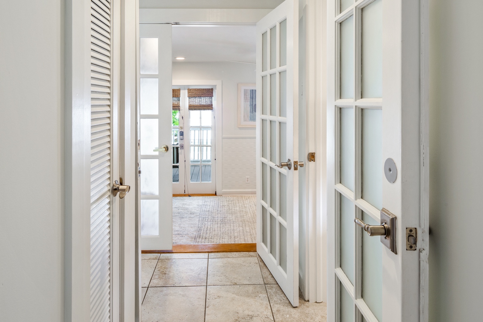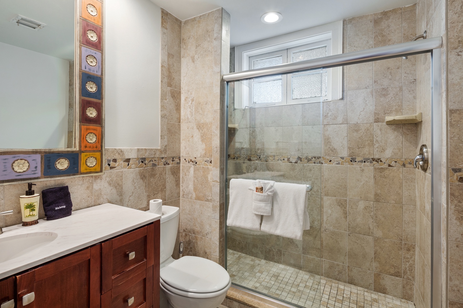 The first bedroom has a new queen size bed. The bedroom bathroom is ensuite. This bathroom has a tub/ shower combination with a dramatic high tiled archway above. The original solarium is now home to a unique bedroom with Cuban tile floors and an ample king size bed. The bathroom is across from this bedroom and has a tiled walk-in shower.