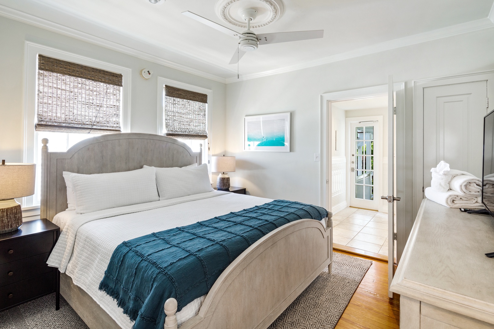 The west bedroom offers a king size bed. The room has knotty pine wainscoting, original Dade County Pine wood planked floors, and large sash windows. The bathroom is also ensuite with a tile walk-in shower.