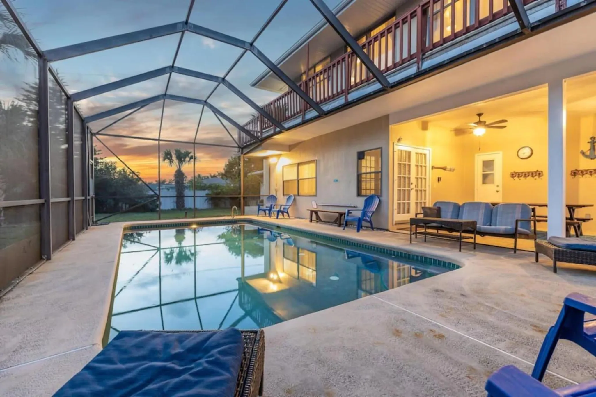 Walk 2-min to the beach. Swim in the heated pool in a screened pool house. Gather and relax in the covered lanai with picnic table & gas grill.