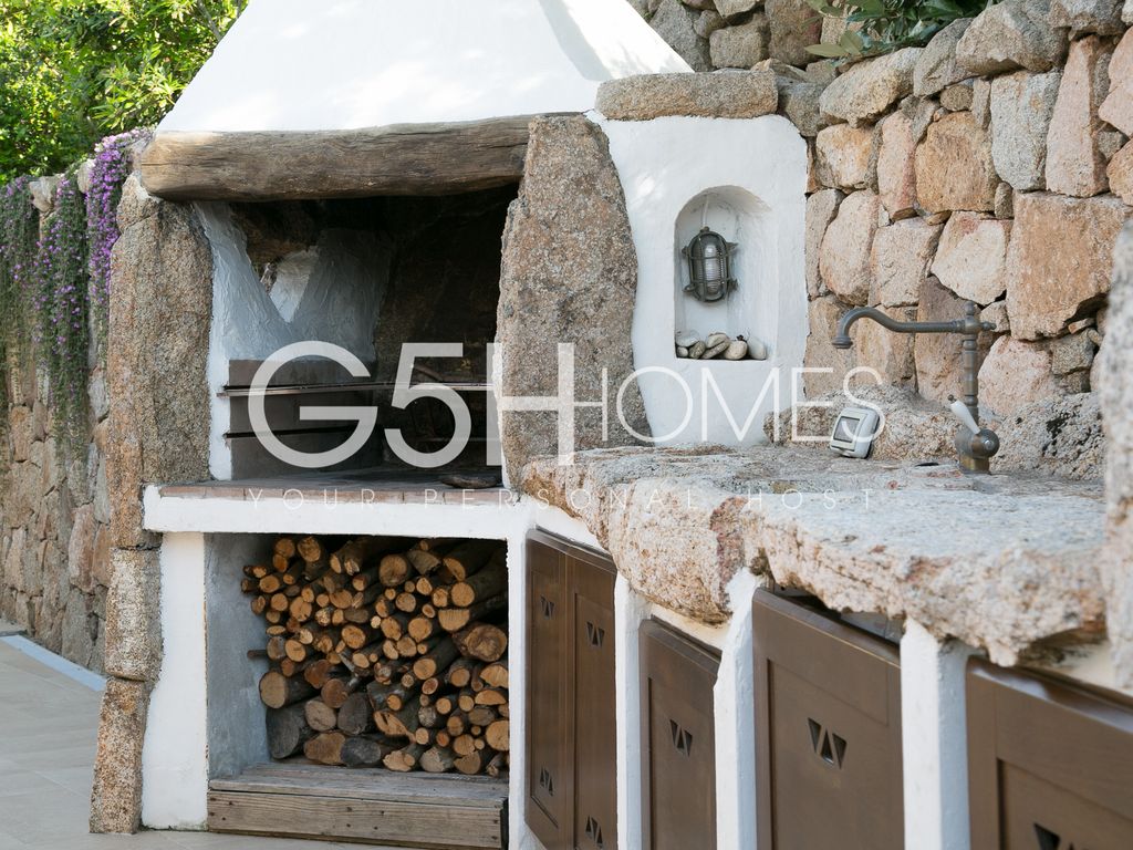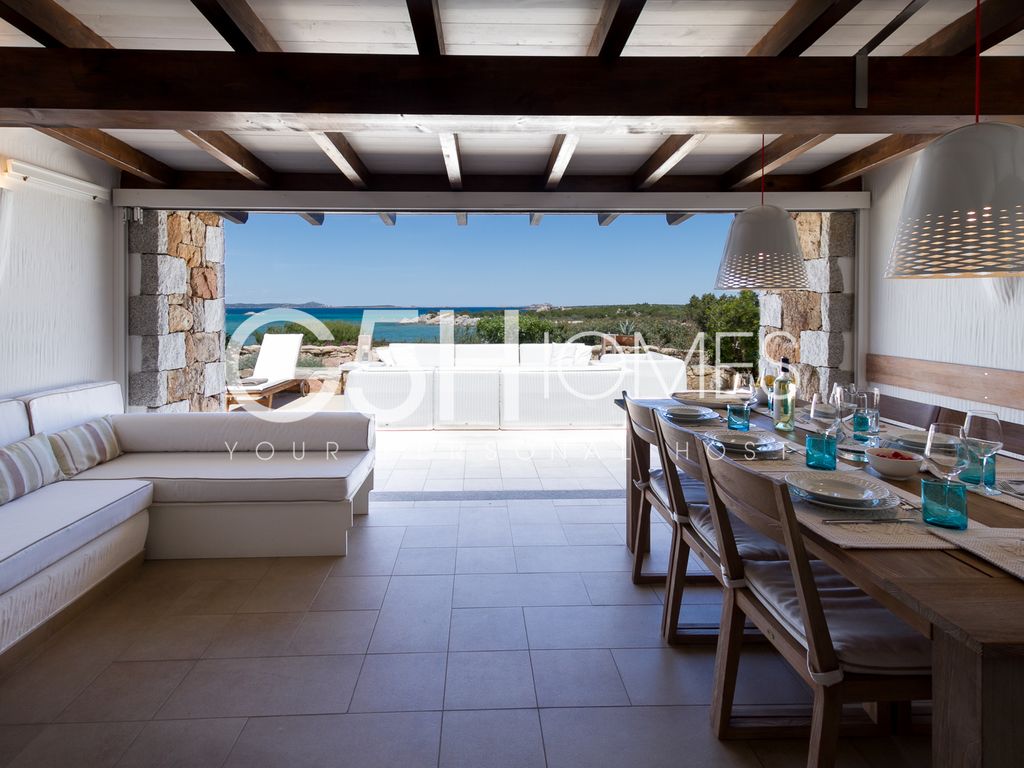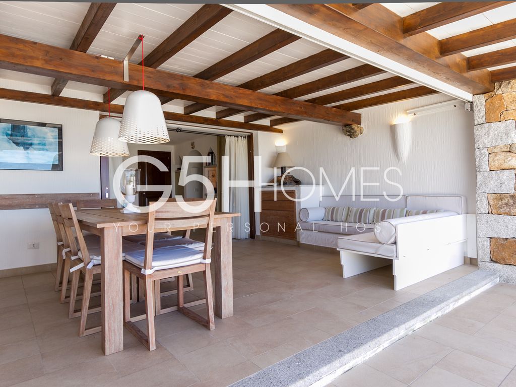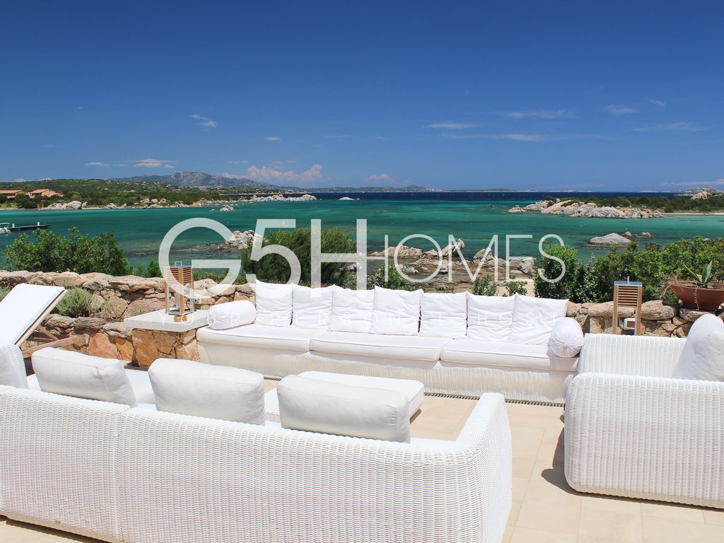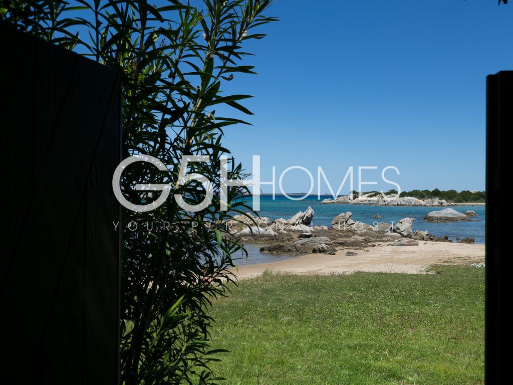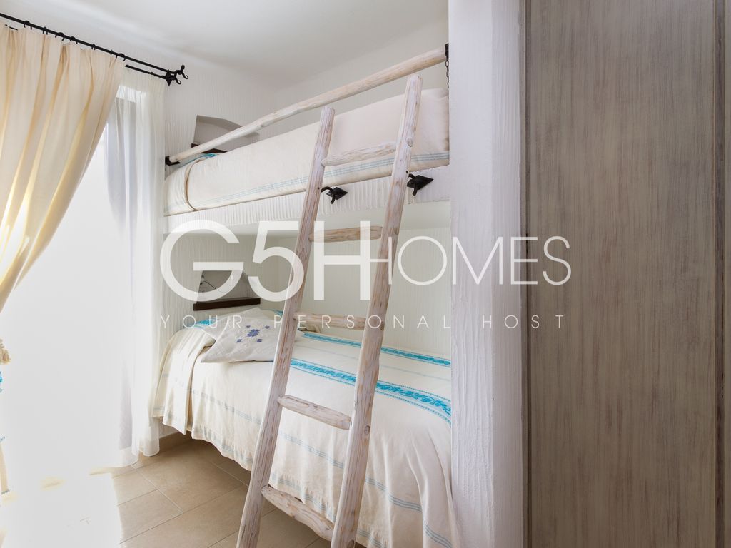 This lovely, tastefully restored villa is situated in an exclusive panoramic location, commanding a breathtaking view of the sea. Cool, secluded, independent and comfortable, it is the every family holiday dream home. The patio is the hub of the house, providing a fluid and homogeneous continuity between indoor and outdoor areas: the glistening and fragrant sea of Sardinia can be enjoyed in the ample open space created by the lounge, patio and terrace. The fully fenced garden surrounding the villa, very safe for children, has a direct and private access to a small sandy beach bordered by rocks. The villa overlooks a small bay with shallow waters, ideal for children and for a relaxing swim. In this setting, the sea becomes a private swimming pool. The villa (whose outside walls are tiled in local stone) is composed of: a living room, a fully equipped kitchen, three double bedrooms with air conditioning and flat-panel TV, one bedroom with 2 single bunk beds, 3 bathrooms with shower, a covered patio that can be closed with a beautiful and practical sliding window, a terrace furnished with comfortable white sofas and sun loungers, a fenced garden, an outdoor hot-water stone shower, an outdoor kitchen with stone barbecue. One of the 3 bedrooms has its own private entrance, ideal for guests or for domestic staff. The house is beautifully fitted with custom-made furniture by local artisans and Sardinian textiles. All rooms have sea views and are equipped with sliding windows and fly screens. Internet is free and Wi-Fi. The beach just below the house and the whole setting makes this the perfect home for one or two families with children who want the best for their vacation. Every day you can go to a different beach, since there are also many other beautiful sandy beaches and small coves within walking distance from the villa. In a radius of 500 meters, there are 2 bars, 2 restaurants, a small supermarket, a newsagent and tobacconist, rental boats and paddleboats, a windsurfing school.