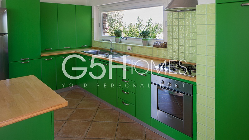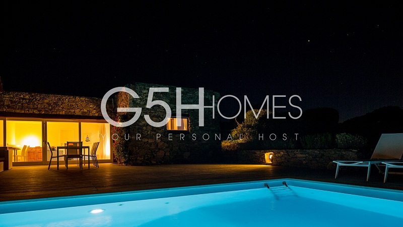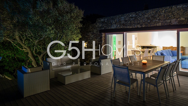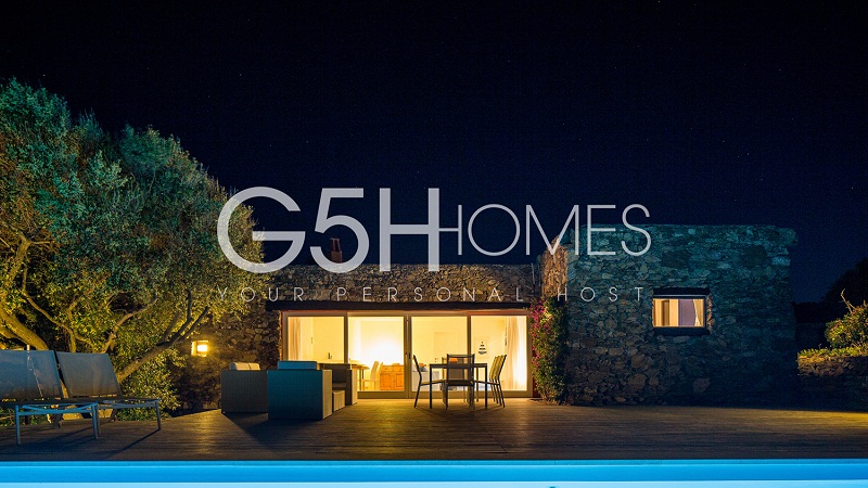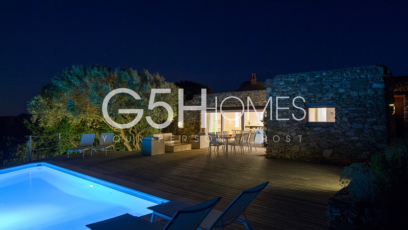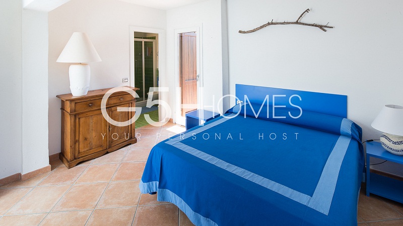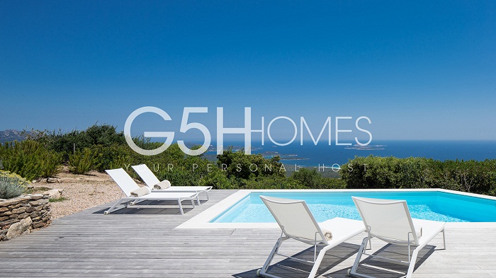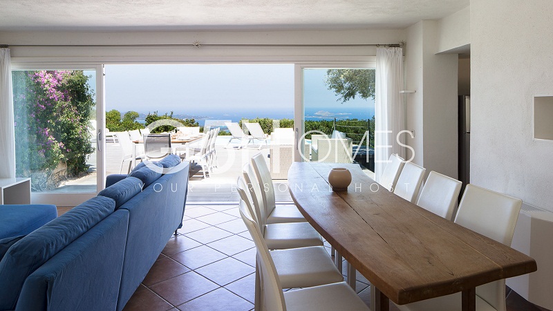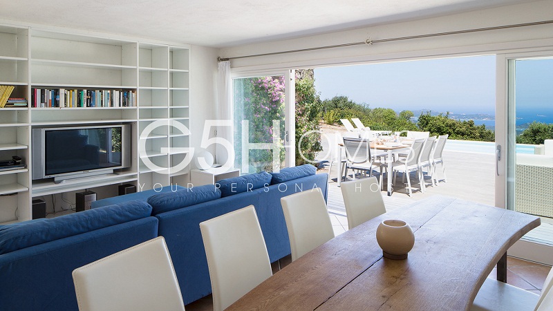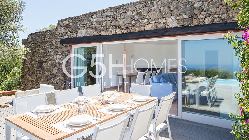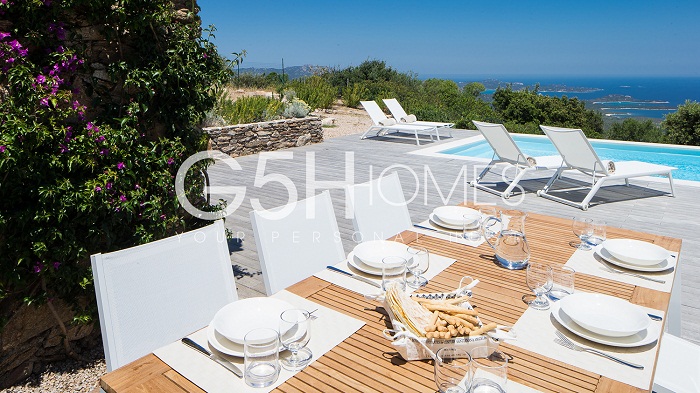 Beautiful villa for 8 people situated on the top of a hill, which dominates the entire Emerald Coast. The view from the pool area and sundeck is particularly stunning. If you are looking for peace and tranquillity, this villa, with its magnificent view of the sea and its private swimming pool, is the ideal solution. An exclusive property sheltered by Mediterranean maquis, interrupted only by granite rocks in whimsical shapes. The villa rises on a plot measuring 14.000 square metres, with over 600 square meters of terraced gardens, including the patio with a large table for 8, parasols and white sunbeds by the pool area. This beautiful single-level property has been recently renovated and can accommodate up to 8 people. All its 4 bedrooms have ensuite bathrooms and are fitted with air conditioning and fly screens. There are three elegantly furnished master bedrooms and one bedroom with twin beds that is ideal for children or domestic staff. Kitchen is fully equipped and opens onto the large and bright living room with a fireplace and a dining table for 8. A wall-to-wall sliding window allows the light to flood the room, creating a wonderful continuity between the living room and the large teak terrace, where there is another dining table for 8, perfect for romantic dinners, and a sofa. On the same level is the new pool where you can enjoy a spectacular view.