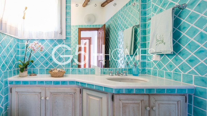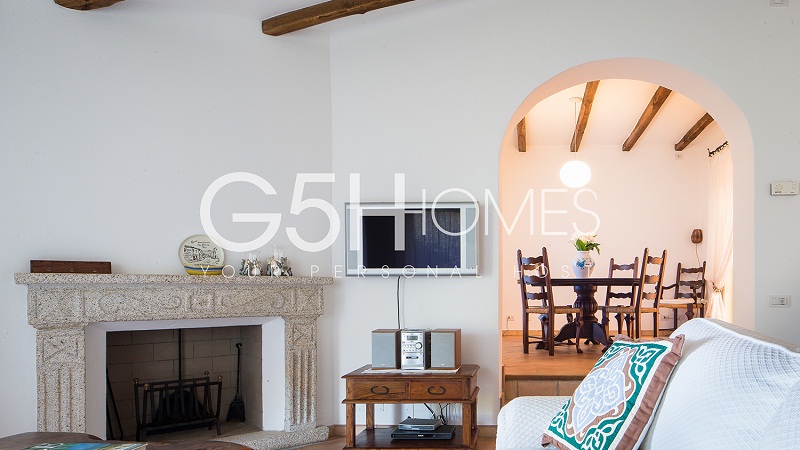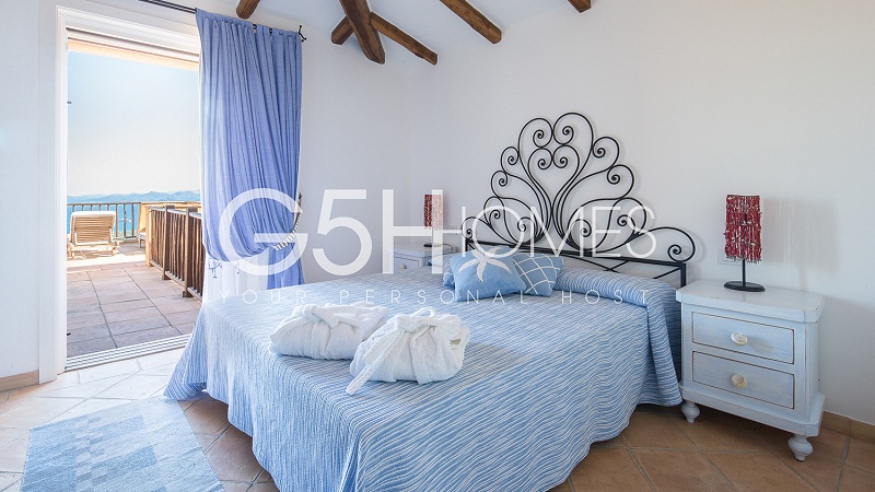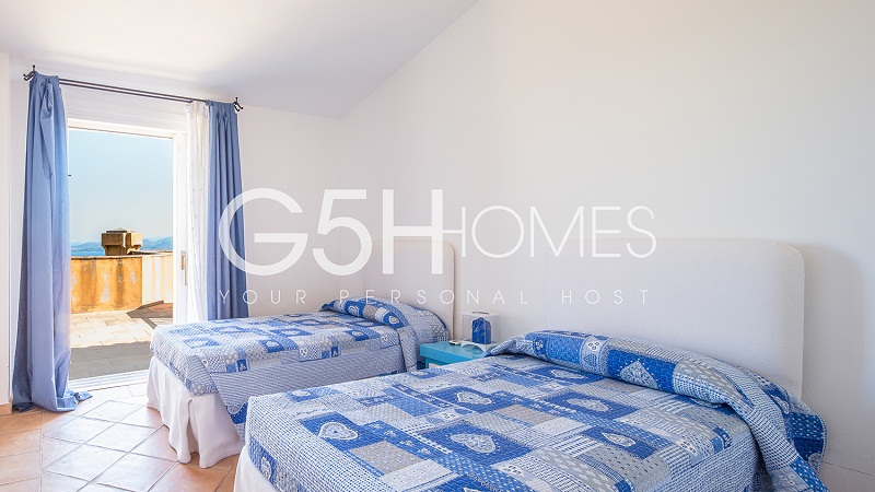 The ground floor consists of a dining room, a large and bright living room with a large picture window, a fireplace and satellite TV, a fully equipped kitchen and a small guest bathroom. The covered veranda is furnished with comfortable sofas and an outdoor dining room with a lovely view of the surrounding sea. The sleeping area, on the first floor, consists of 4 bedrooms and 3 bathrooms: one master bedroom with ensuite shower bathroom, one double bedroom with ensuite bathroom with tub, one twin bedroom for children, one single bedroom, ideal for the nanny, and another bathroom with shower. All rooms have sea views and are equipped with air conditioning. The main rooms have access to a large terrace.