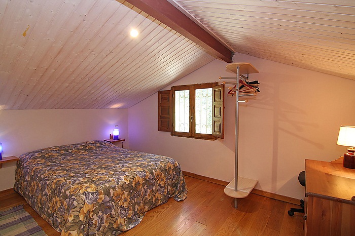 Attic–sleeping area with a sloping ceiling is charming and access to it is up a winding staircase that starts in the dining area. It has a double bed (king size), two lamp tables a chest of drawers and a coat and suit hanging bar.