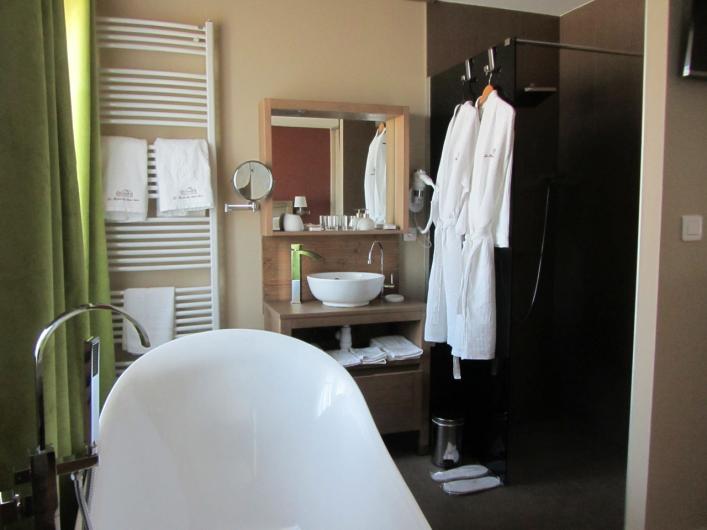 160-cm bed, closet space, Bluetooth multimedia tower, flat-screen TV, desk, Wi-Fi, private bathroom opening into the room with a free-standing bath, walk-in shower, vanity unit, hair dryer, magnifying mirror, heated towel rail, foot mirror, private separate WC. A 90-cm fold-up bed for a child and/or a cot, high chair and changing mat are available on request.