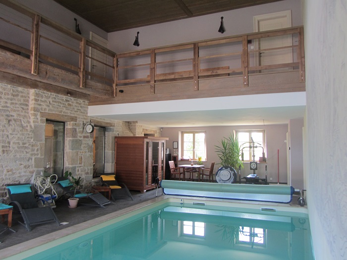 Two 90-cm beds or one 180-cm bed, closet space, Bluetooth multimedia tower, flat-screen TV, desk, Wi-Fi, private bathroom with walk-in shower, vanity unit, hair dryer, magnifying mirror, heated towel rail, foot mirror, private separate WC, bedroom entrance with a view overlooking the indoor pool from the mezzanine. A travel cot, high chair and changing mat are available on request.