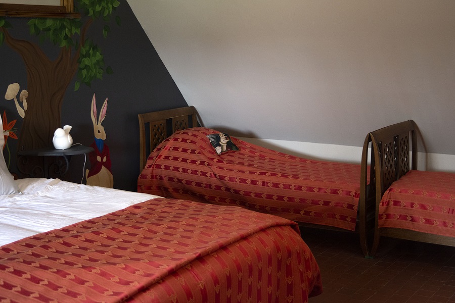 Wide and warm colours, its beds can be proposed in twin beds or in a double bed. It is provided with 2 quilts and 4 pillows, one wardrobe,one drawers chest, one table, and two arm chairs, one tv set and a kettle to make a tea or a coffee.