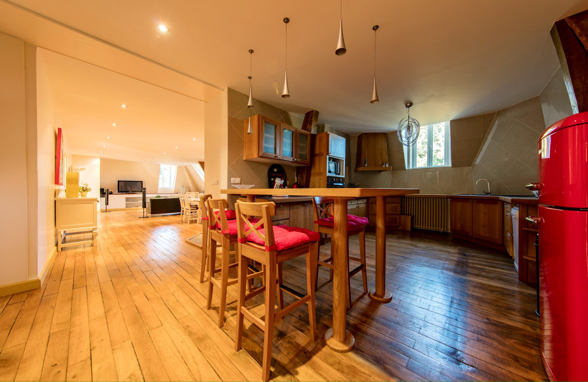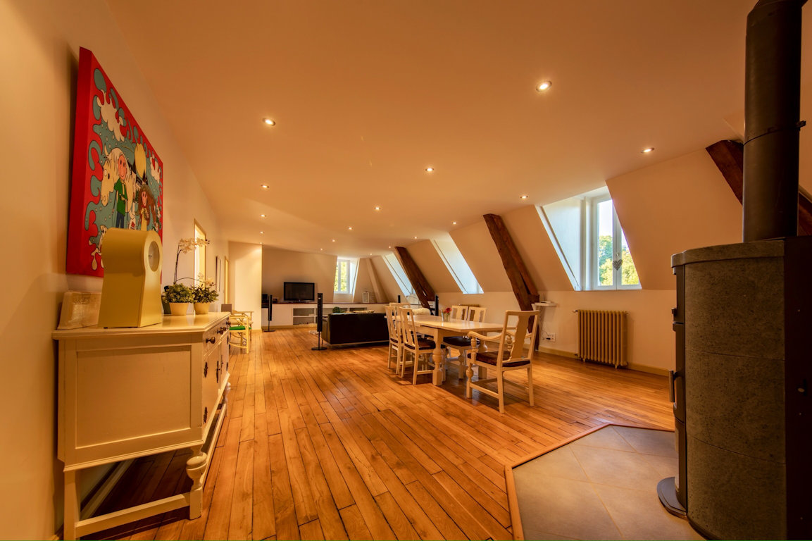 ituated under the Grand Salon of the castle, the old servants quarters have been converted into a modern apartment for two people, located on the mezzanine floor and with direct access to the outside, onto the gardens .Spanning a surface of 95 m2, it includes a double bedroom, a large private bathroom (with walk-in shower and bath), a living-dining room and a well equipped kitchen. Indulge in a thermal cure, or a romantic getaway in Auvergne, at any time of the year and opt for the upscale comfort of accommodation in our characterful château.