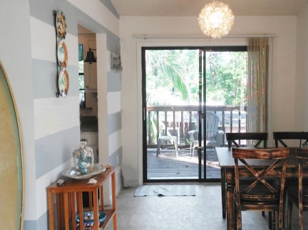 Stilted house sits on a large lot with lush tropical foliage and large shade trees. The deck off of the kitchen and dining area overlooks the tropical canopy. Enjoy balmy afternoon and evening breezes as you enjoy drinks while you grill your day's catch.