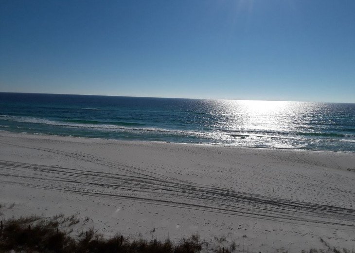 Beautiful views of the white sugar sand beach and crystal clear water. Sixty feet long eight feet high glass wall from floor to ceiling along the beach. Sliding glass doors are in bedrooms and living room. All rooms including dinning room see beach and ocean.