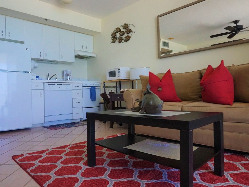 The bedroom has a king-size bed, New tiled floor and new furniture. and there 1 twin sleeper in the living room. The unit will accommodate 4 people. The unit is equipped with a full kitchen that includes stove, oven, refrigerator, microwave, dishes, pots, pans, utensils, coffee maker, blender, and lots more. The unit is equipped with HIGH SPEED DSL, 2 TVs / DVD player, all linens, bath towels, 6' thick beach towels, beach chairs and beach cooler. The unit has a private balcony with table and chairs and the Sunsets are amazing.