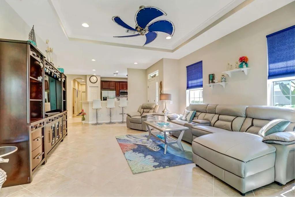* Large, open concept living area with leather reclining furniture, large flat screen TV with cable package, Blu-Ray DVD Player, sliding glass doors open to lanai.