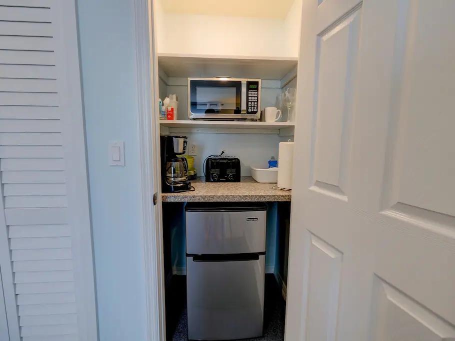 The living room has a fridge and microwave, coffee maker.