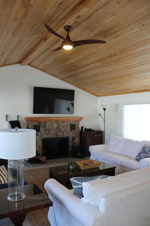 One of the best parts of the cottage is the deck above the boat house over-looking Clam Lake. The deck is perfect for outdoor meals, watching the boats, kayaks, and swans float by, and taking in sunsets over the marina and Clam River bridge. The cottage has a large living room and kitchen and two full bathrooms to accommodate groups. It sleeps 8 comfortably with 2 queen beds, 1 full bed, and 3 twins. The main bedroom has 1 queen bed, sleeping 2. The second bedroom that faces the lake has 1 queen bed, 1 full bed, and 2 twin loft beds, sleeping 5 or 6. There is also a murphy bed with a twin mattress in the living room for additional sleeping. If the size of your group is slightly larger than 8, please contact us to discuss options. The large living room is ideal for entertaining and family gatherings around the fireplace. With cathedral ceilings, a 65” wifi-enabled HDTV to watch your favorite sports and movies, and plenty of comfortable seating on two couches, two arm chairs, and several director’s chairs that can be moved around as needed, your family and friends will have plenty of space to enjoy a memorable and relaxing vacation. We gave the living room and second bedroom fresh paint and updated the furniture in the living room and second bedroom to give the cottage a fresh new look. The garage and driveway can hold up to 4 vehicles or 3 vehicles plus your boat trailer.