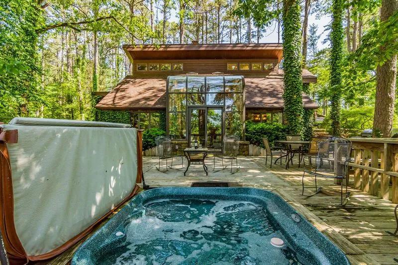 The architecture of The Sanctuary was inspired by the famous architect Frank Lloyd Wright whose use of light, water and natural surroundings accentuate the home. Blending home and landscape is beautiful mature climbing ivy complemented with the generous use of native hand-laid stone, wood, and beautiful glass. The home features extensive stonework, waterfalls and ponds that contribute to the peaceful atmosphere. The deck, with its hot tub, outdoor pool table, and patio furniture, is the perfect place to relax and take in the views.