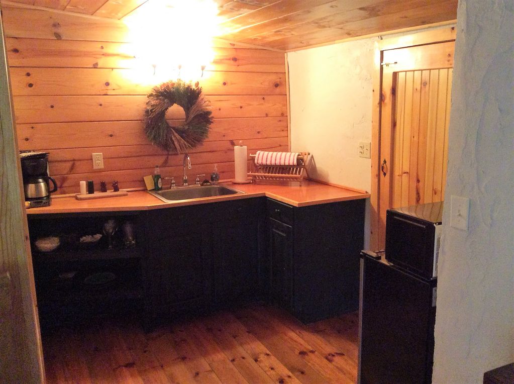 - Kitchenette with mini-fridge, microwave, skillet, toaster oven, dishes, and silverware