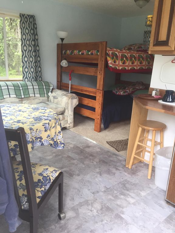 There is a kitchenette; sink, frig, stove top. Coffee maker, microwave and toaster. Also a sofa, table and chairs. There is a set of bunks, both double size. It will sleep 2-4 people. A play-n-pak is available if needed. There is a full bath. Also, there is a nice HOT TUB, a freezer and a grill!